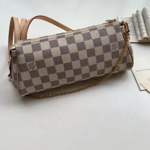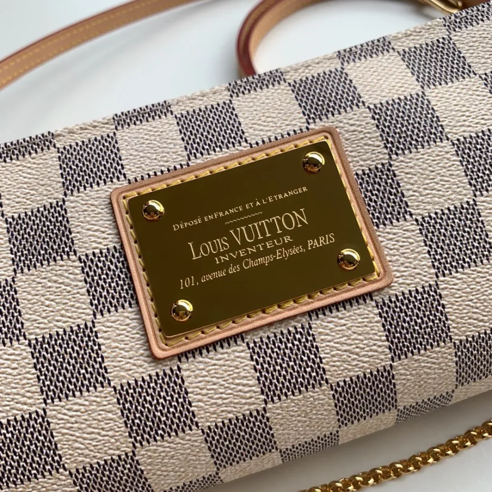 Classic and versatile Louis Vuitton Eva shoulder bag rendered in the house’s Damier Azur checked coated canvas with natural Vachetta leather trim, puckered side panels and accented with gold-tone brass hardware showcasing ‘Louis Vuitton Inventeur’ engraved name plate on front. Featuring a convertible chain-link shoulder strap as well as a detachable leather crossbody strap, this bag can be purposed for a variety of looks.