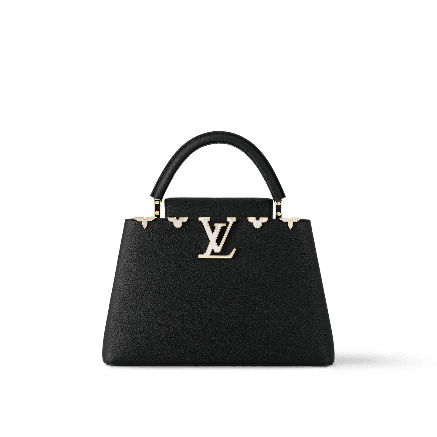 The Capucines MM handbag radiates feminine sophistication in black Taurillon leather, with a crown of Monogram Blossoms in mother-of-pearl around the top of the bag. The elegant colorway and jewel-like flowers make this bag the perfect day-to-evening companion. A top handle and thin removable and adjustable strap give carry options.