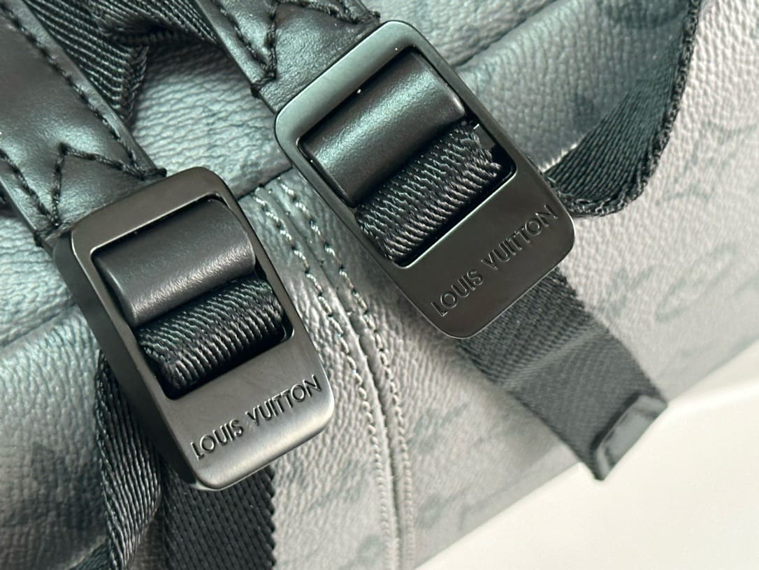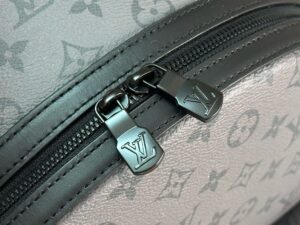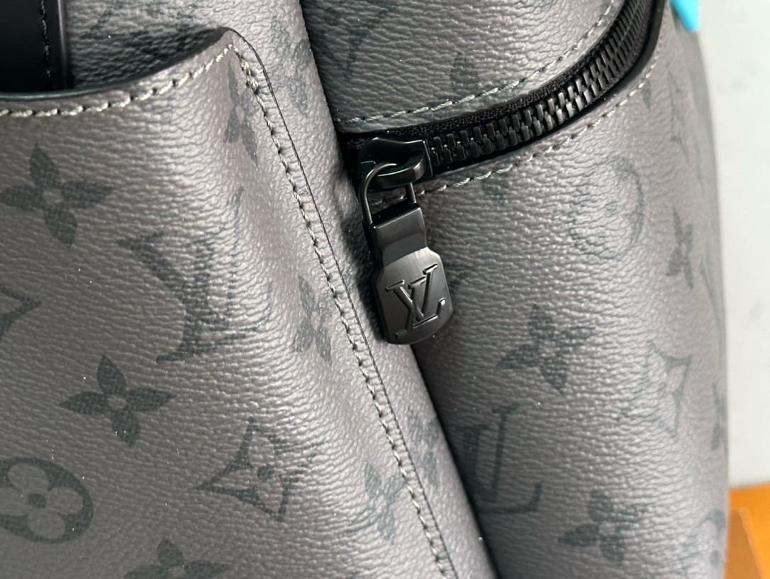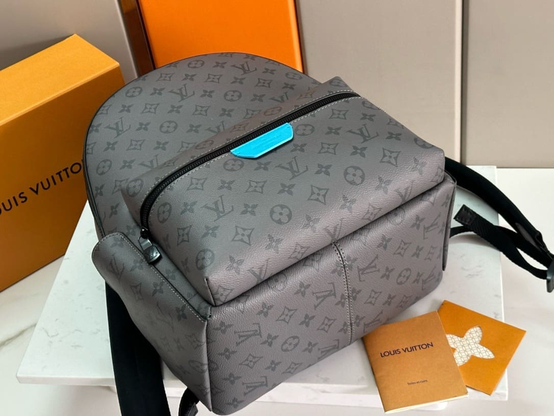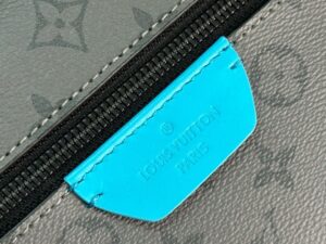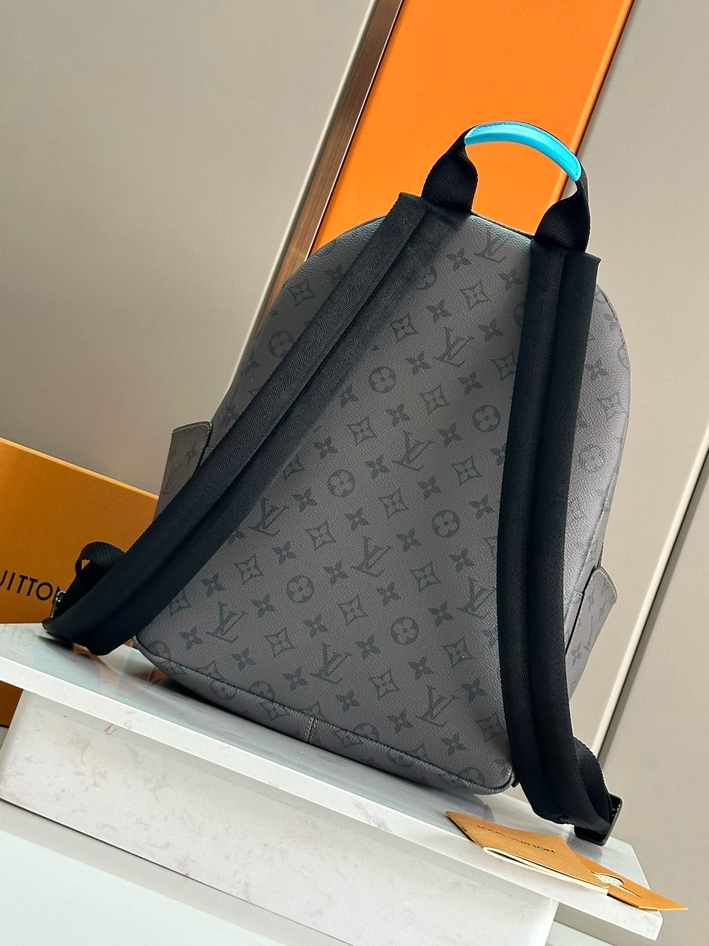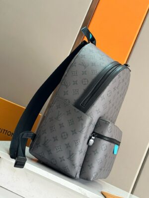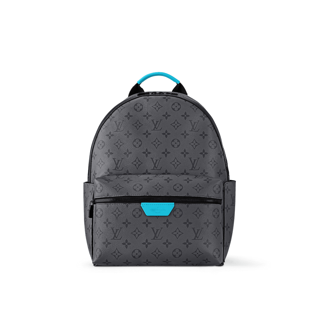 The Discovery Backpack PM is made from Monogram Eclipse Reverse canvas with its black-and-gray Monogram. The motif is livened up with turquoise on the leather label on the front pocket, around the zipper, and on the top handle. Its zipped front pocket and two open side pockets make this is a great everyday bag.
