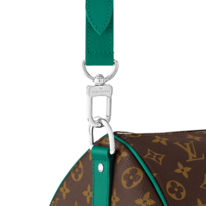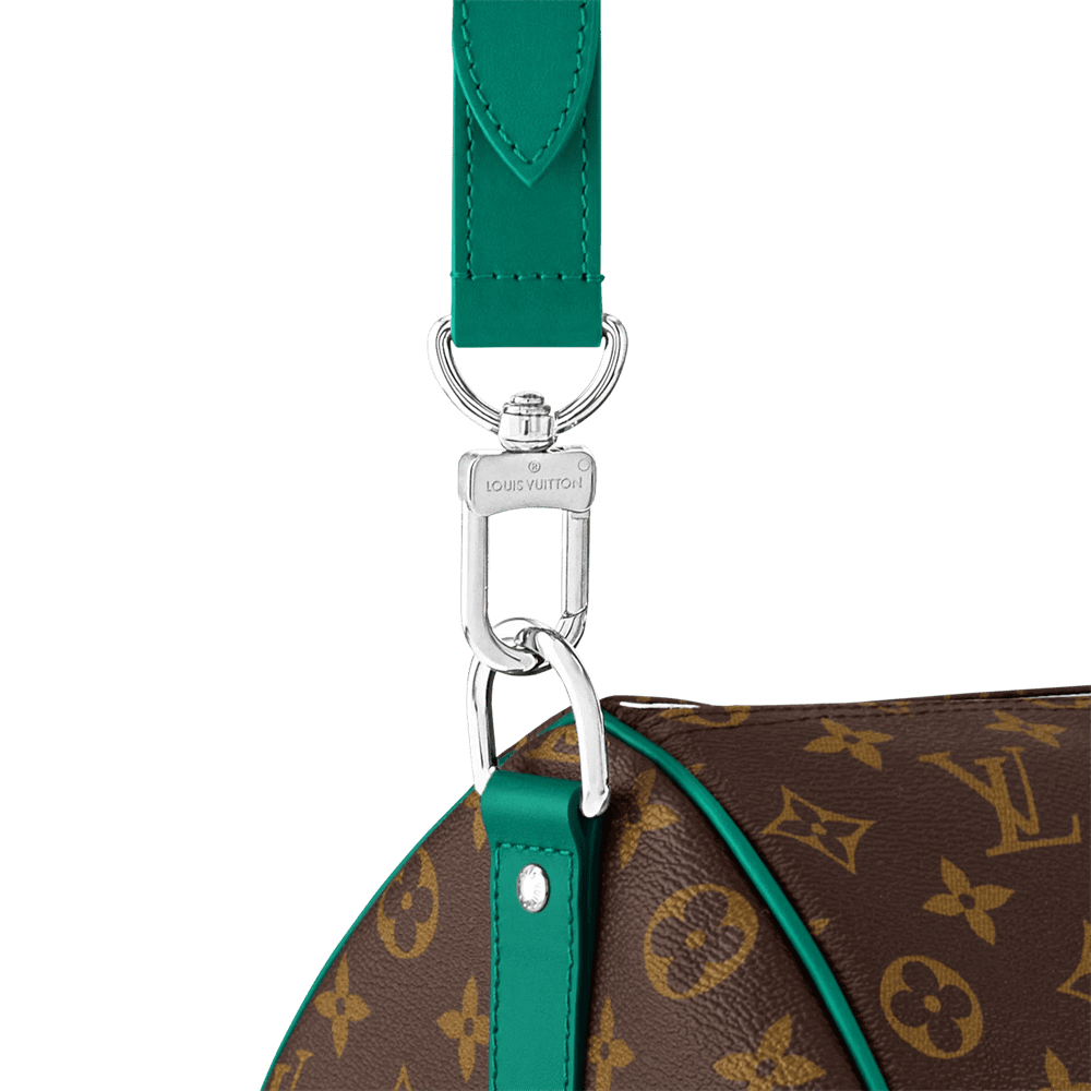 Brightly colored leather details bring a fresh feel to this Keepall Bandoulière 50 travel bag in Monogram Macassar canvas. The top handles, the removable shoulder strap, even the leather name tag, are all in the same bright color. The bag is lined in a striped textile inspired by the linings of the House’s original trunks.
