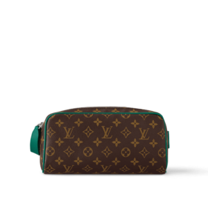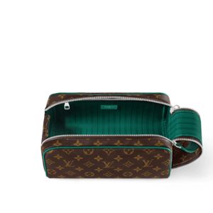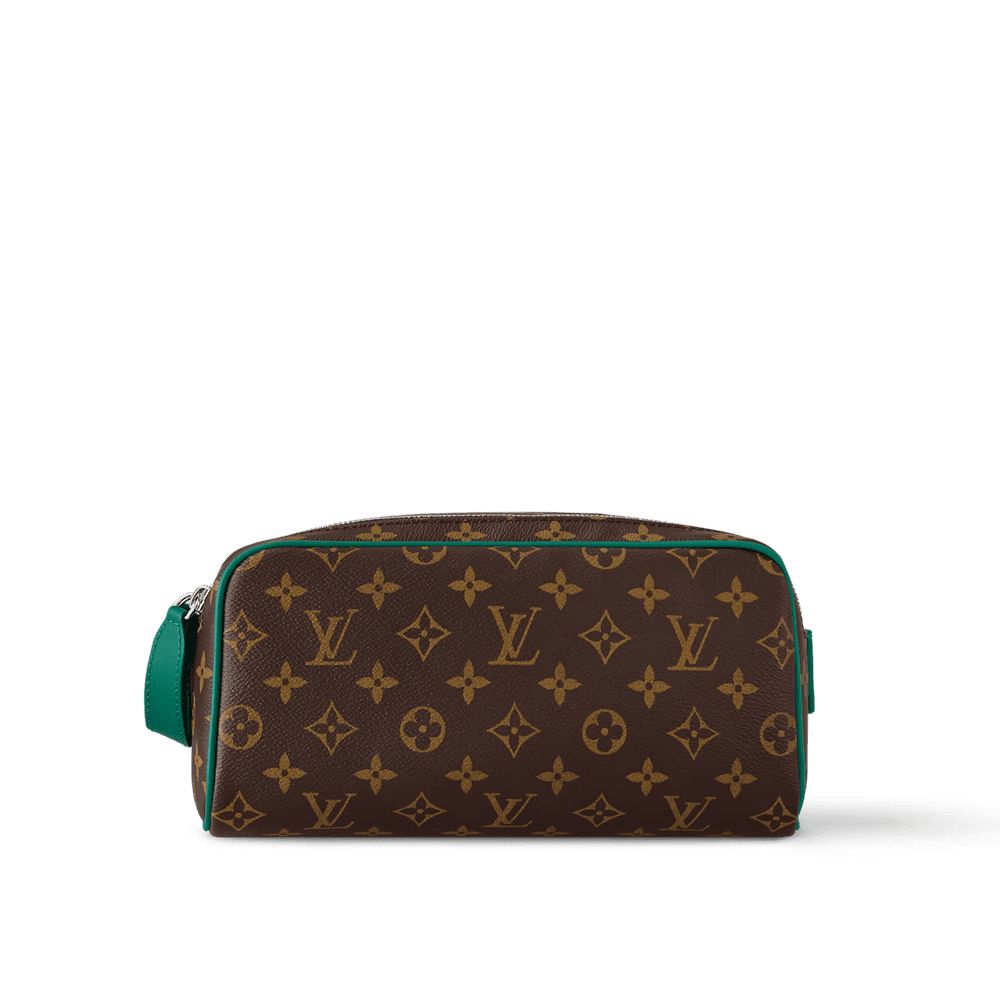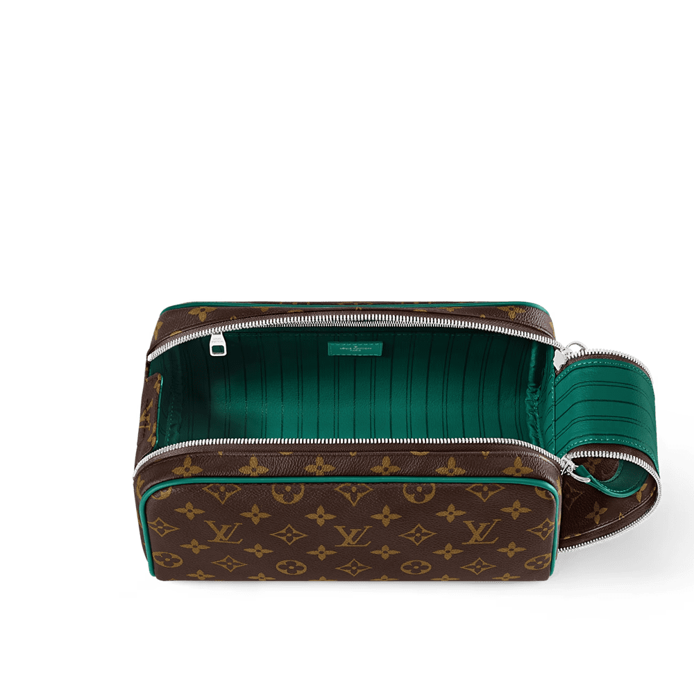 Sturdy and practical, the Dopp Kit in Monogram Macassar coated canvas is adorned with colored piping and colored leather on the handle attached to the double zipper. Designed for storing grooming essentials and toiletries, it has a washable lining in the same color as the color of the exterior details.
