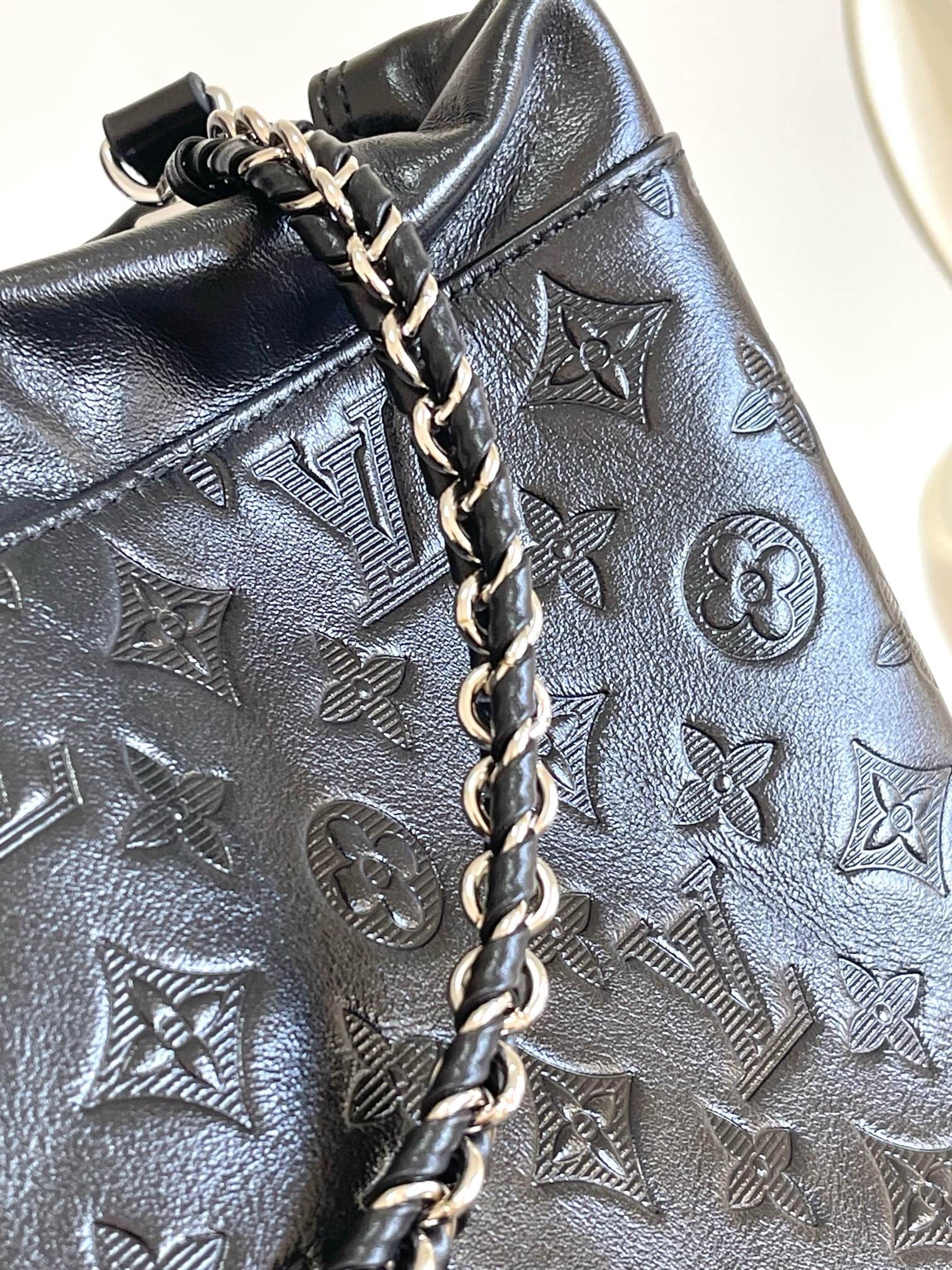 The 2025 Cruise Early Spring Collection reinterprets the classic Noé handbag, adding a new member to the Trunk family. The elegant sheepskin is embossed with a Monogram pattern, and the leather corners and drawstring closure continue the iconic details. The detachable shoulder strap and braided chain enable hand-held or cross-body options.