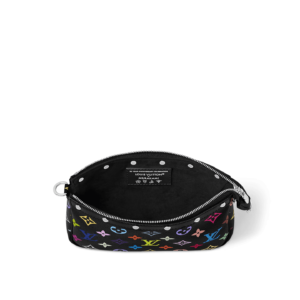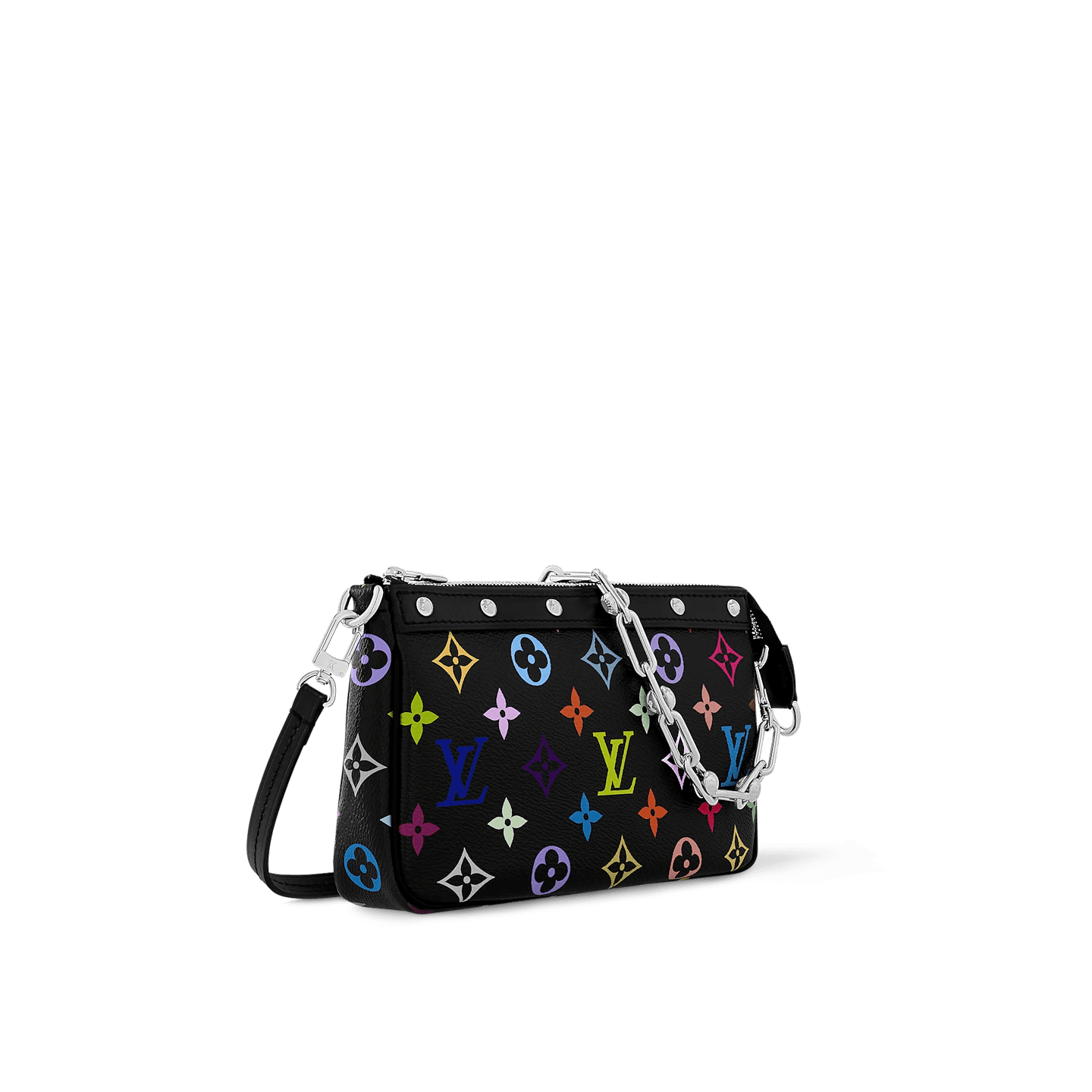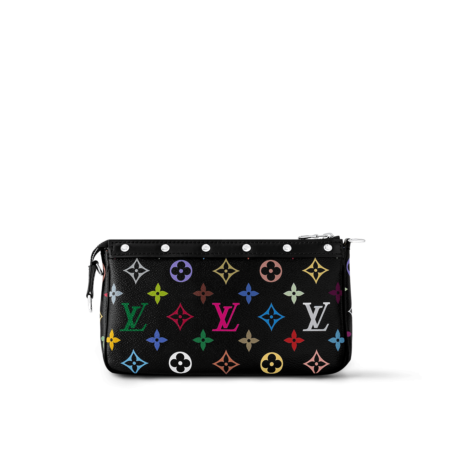 This playful edition of the classic Pochette Accessoires is joyfully reimagined with a multicolored Monogram motif as part of the cross-category Louis Vuitton x Murakami collection. Crafted from coated canvas in a petite pouch shape, a natural cowhide-leather trim adds an emblematic House touch, while golden hardware introduces a chic polished accent. Complete with a removable strap and chain for versatile styling options.