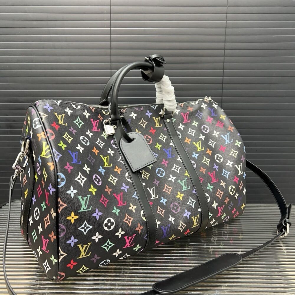 The iconic Keepall Bandoulière 50 makes a bold signature statement in Monogram coated canvas that has been playfully reimagined with vibrant rainbow tones inspired by the work of world-renowned Japanese artist Takashi Murakami. Sleek black leather bands add structure to the roomy cabin-sized design, complete with elegant top handles and a removable, adjustable strap. A padlock, a name tag and a keybell complete the look with a nod to the House’s travel heritage.