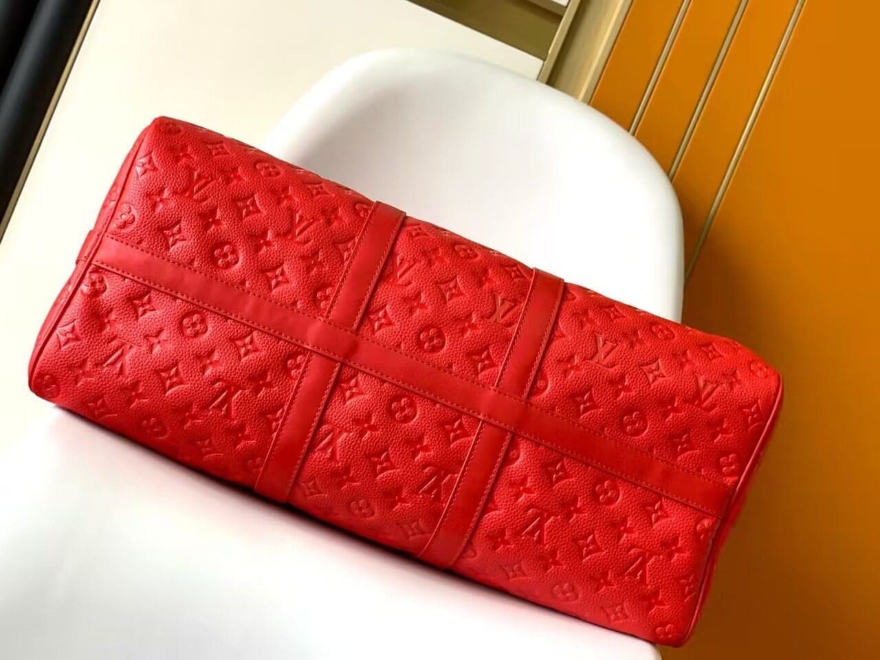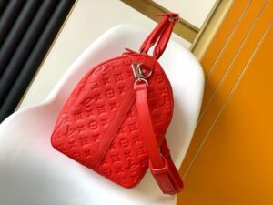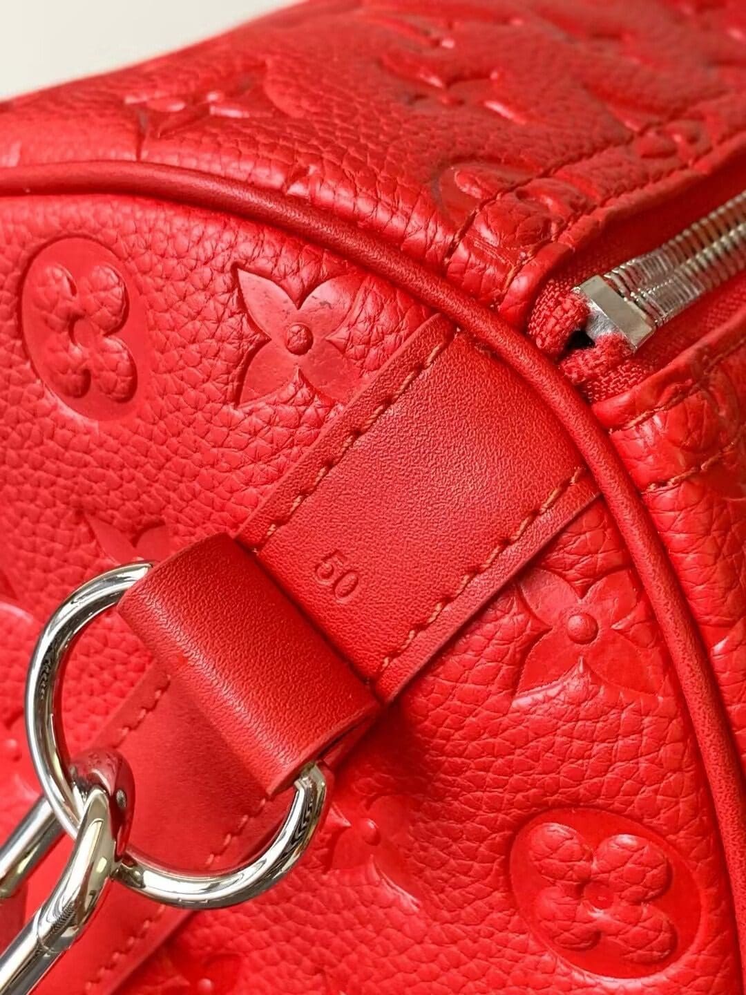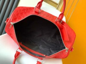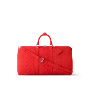 Fashioned from bright-colored Taurillon leather, with the Monogram discreetly embossed into the cowhide, this Keepall Bandouliere 50 travel bag is part of the Travel Rainbow capsule. Lightweight and comfortable to carry, thanks to its removable and adjustable strap, it features an inside zipped pocket in a matching colorway.