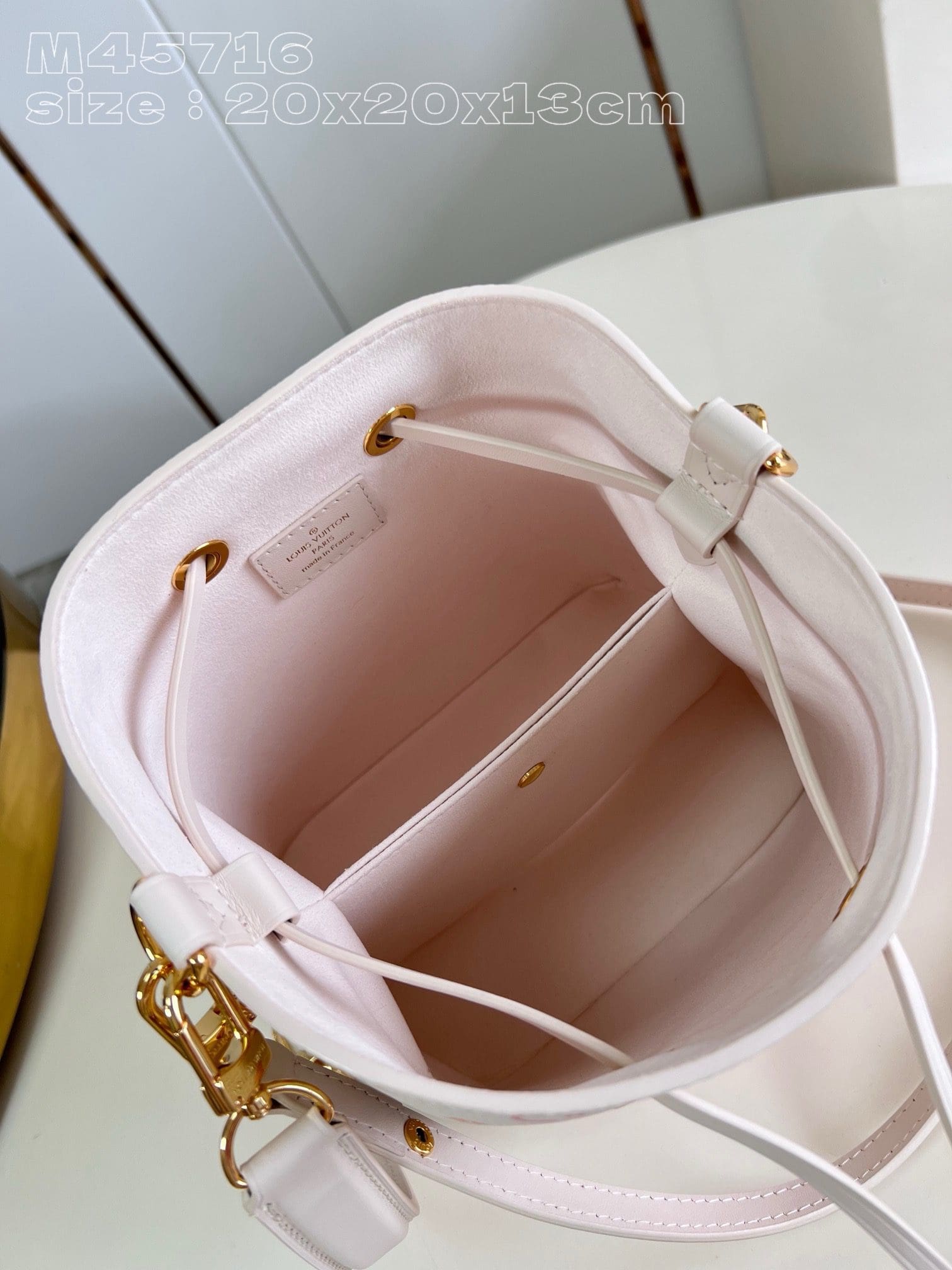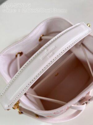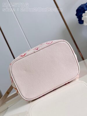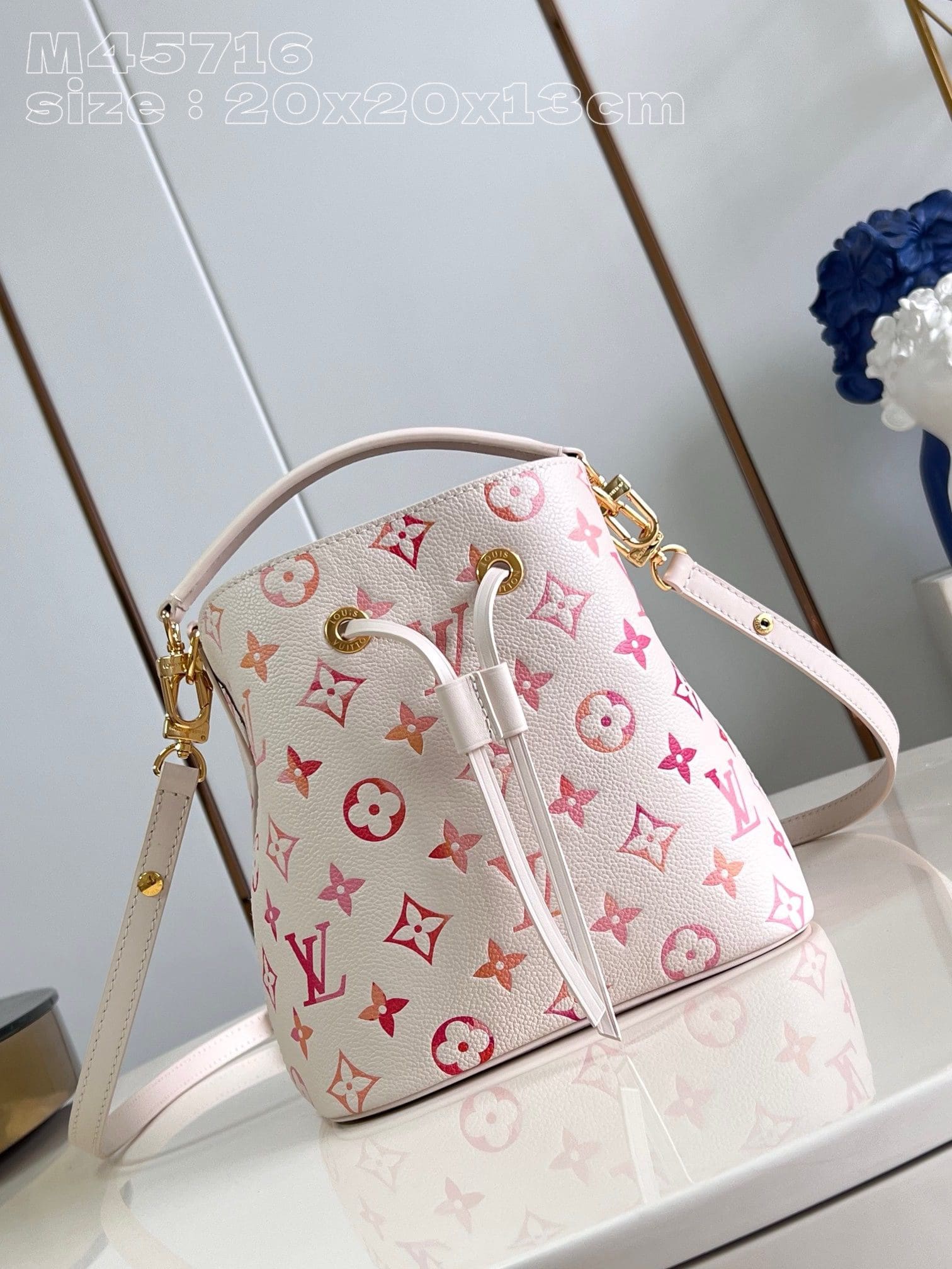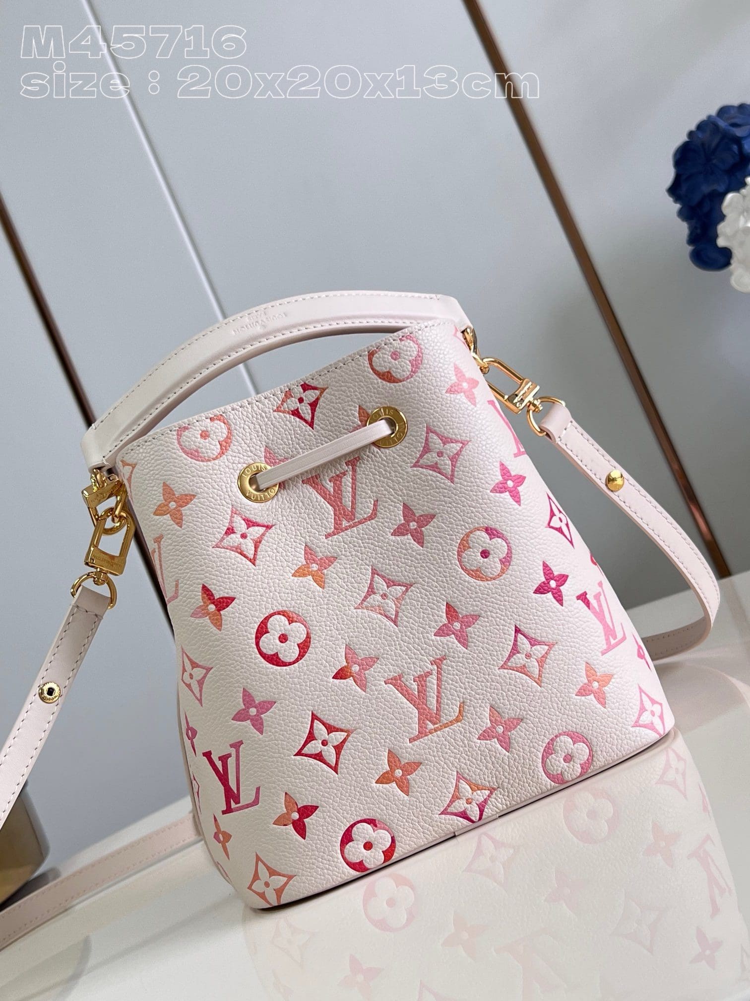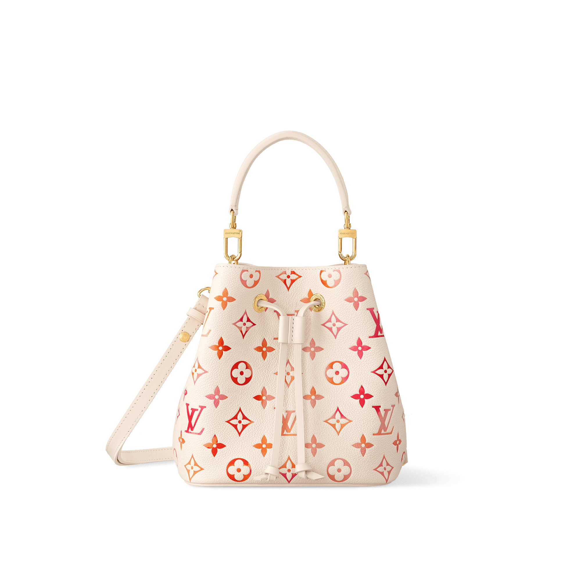 The Aquarelle collection brings a colorful element to the Monogram Empreinte leather of this compact NéoNoé BB bucket bag. Inspired by the soft hues of sunset, a digital printing technique creates orange, pink and fuchsia shades within the Monogram embossing of the leather. A removable handle and a removable and adjustable strap offer multiple carry options.