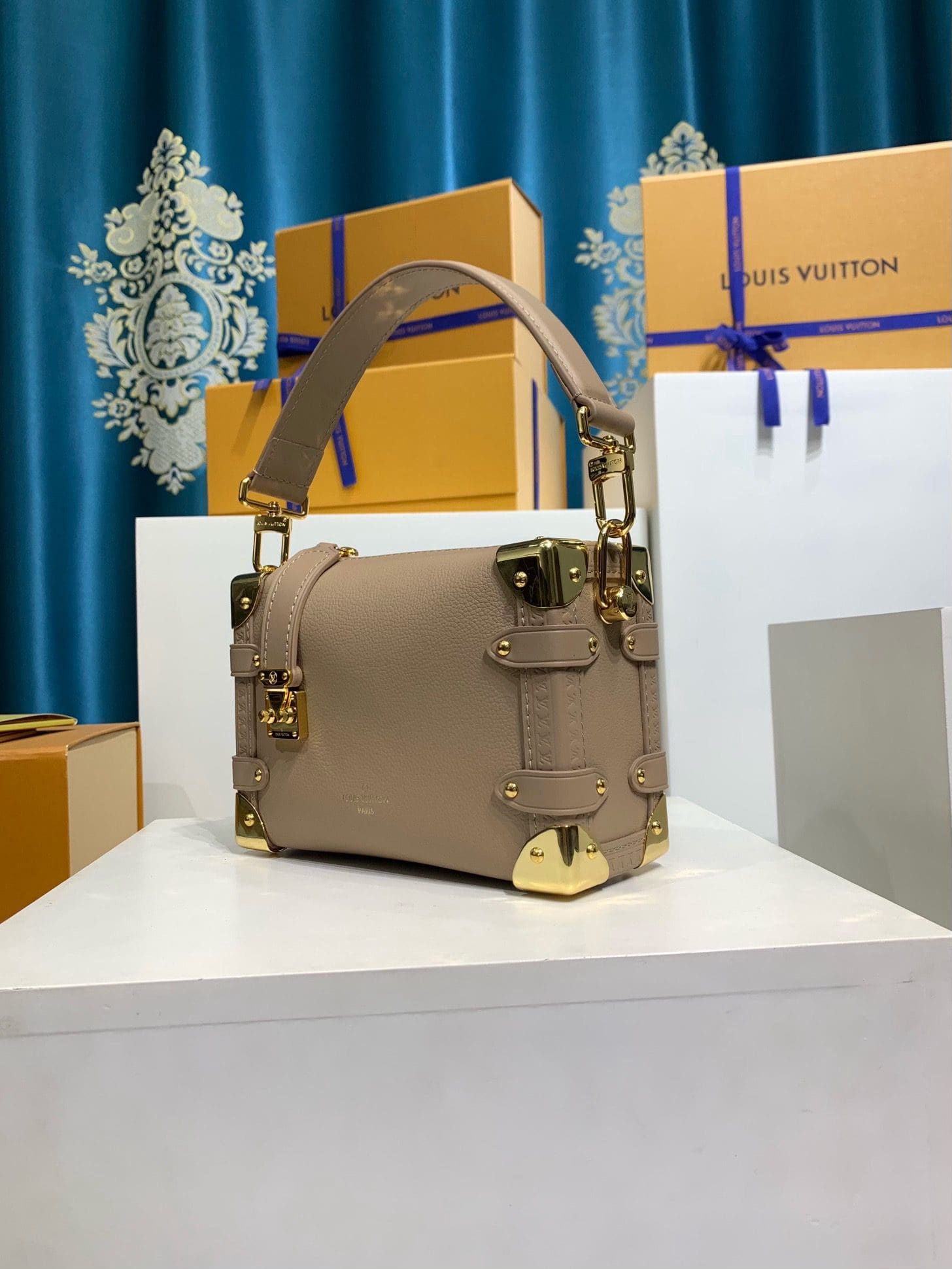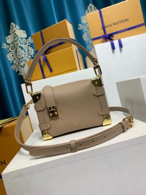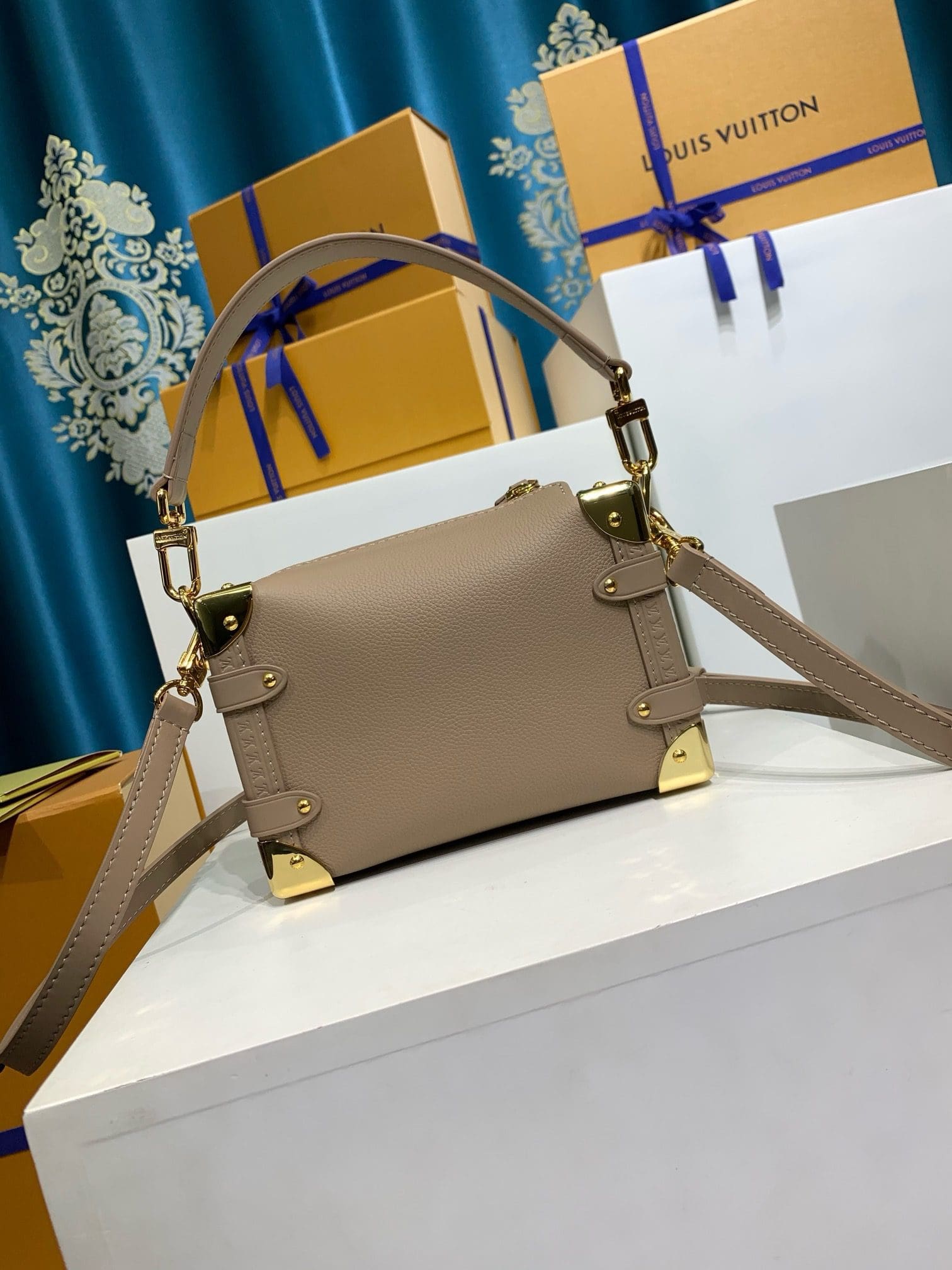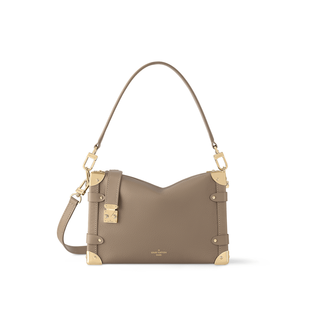 The elegant Side Trunk MM handbag is Creative Director Nicolas Ghesquière’s ode to the House’s historic trunks. Made from grained calf leather with smooth cowhide-leather trim, it features an S-lock and reinforced metallic corners. The removable handle enables hand carry while the detachable and adjustable leather strap adjusts for shoulder and cross-body wear.