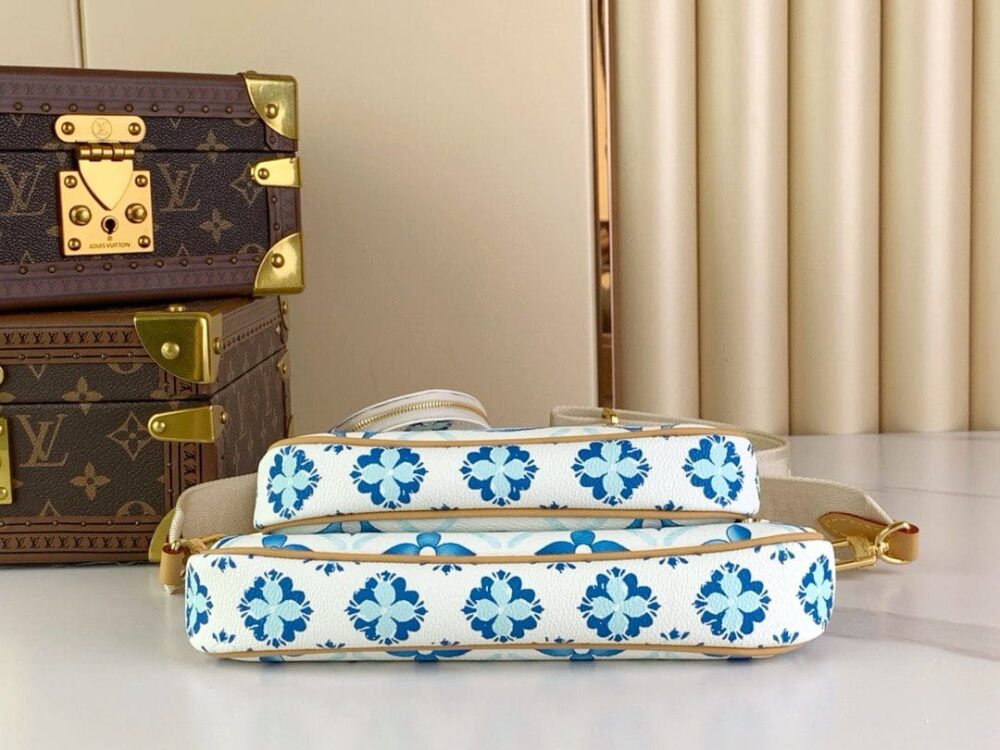 Made from summery Monogram Tiles canvas for the LV By The Pool Collection, the Multi Pochette Accessoires is two zipped pouches that clip together for a hybrid twist on the classic handbag. A wide removable and adjustable textile strap and gold-color chain enable different looks and carry options.