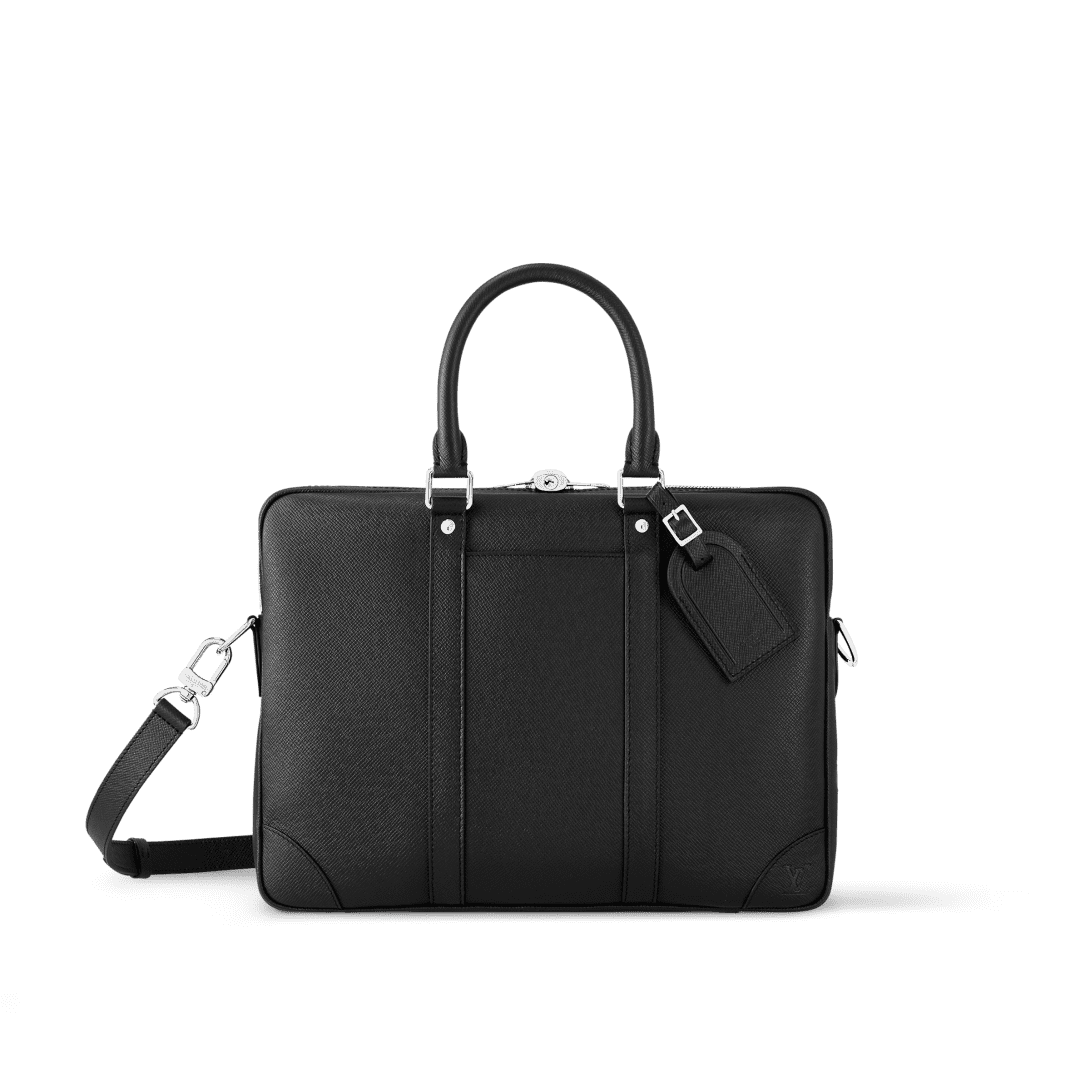 This Porte-Documents Voyage PM attaché case is made from Taiga Noir, a cowhide leather that is first smoothed and polished then embossed with fine grain detailing. The padded interior, roomy enough for a 13-inch laptop, has a double flat pocket on the back. There’s a detachable and adjustable shoulder strap in addition to the top handles.