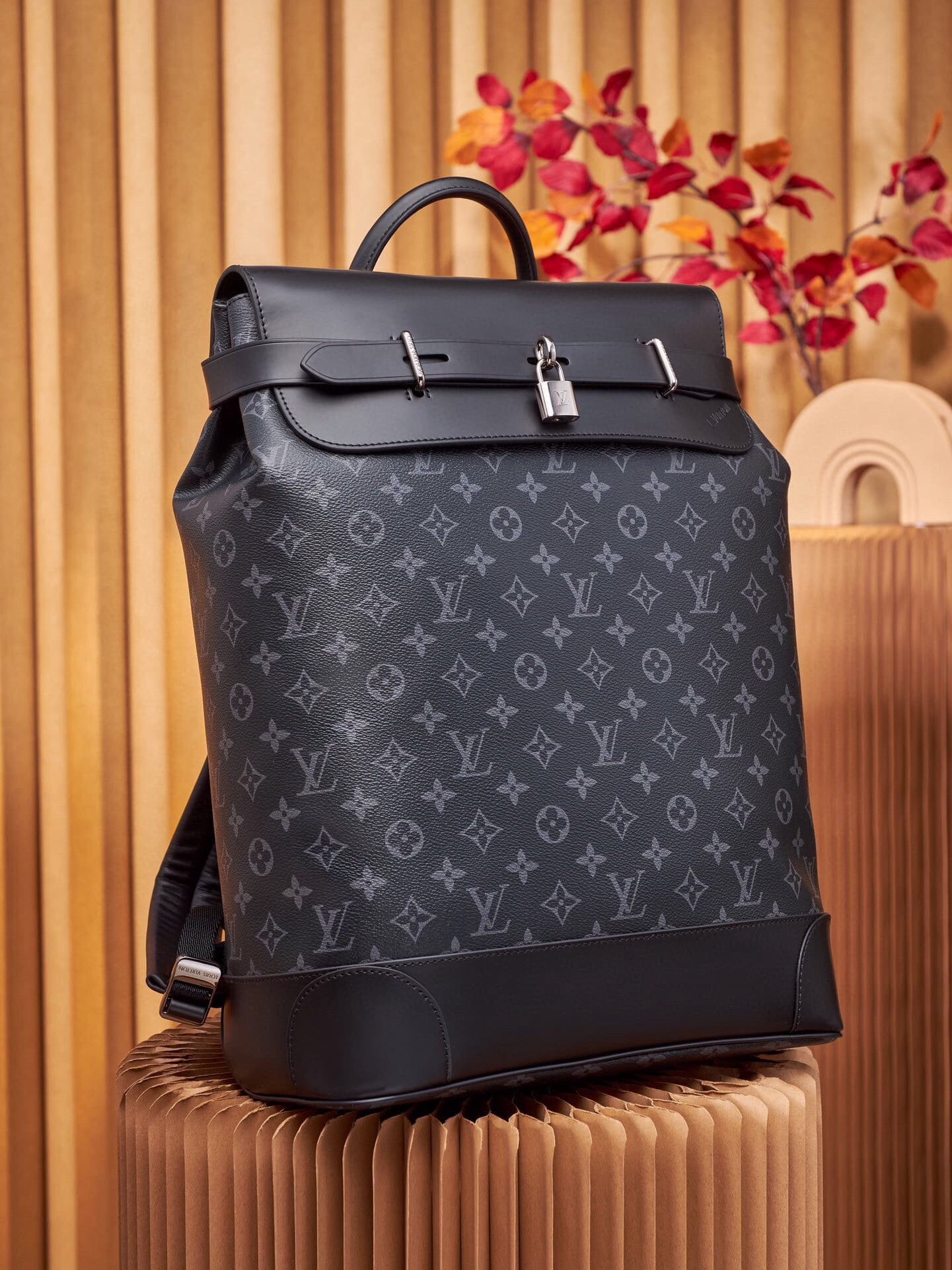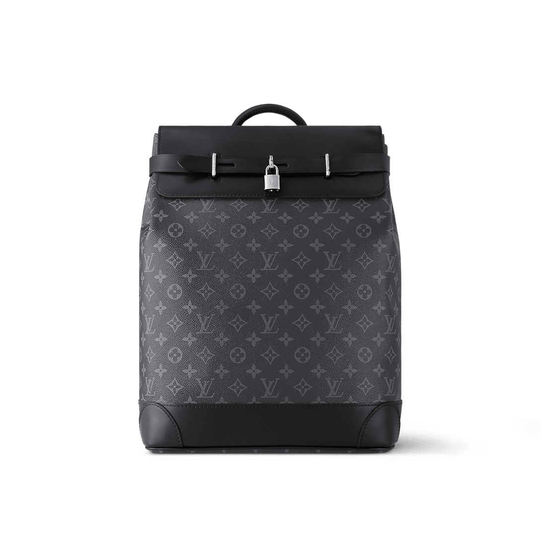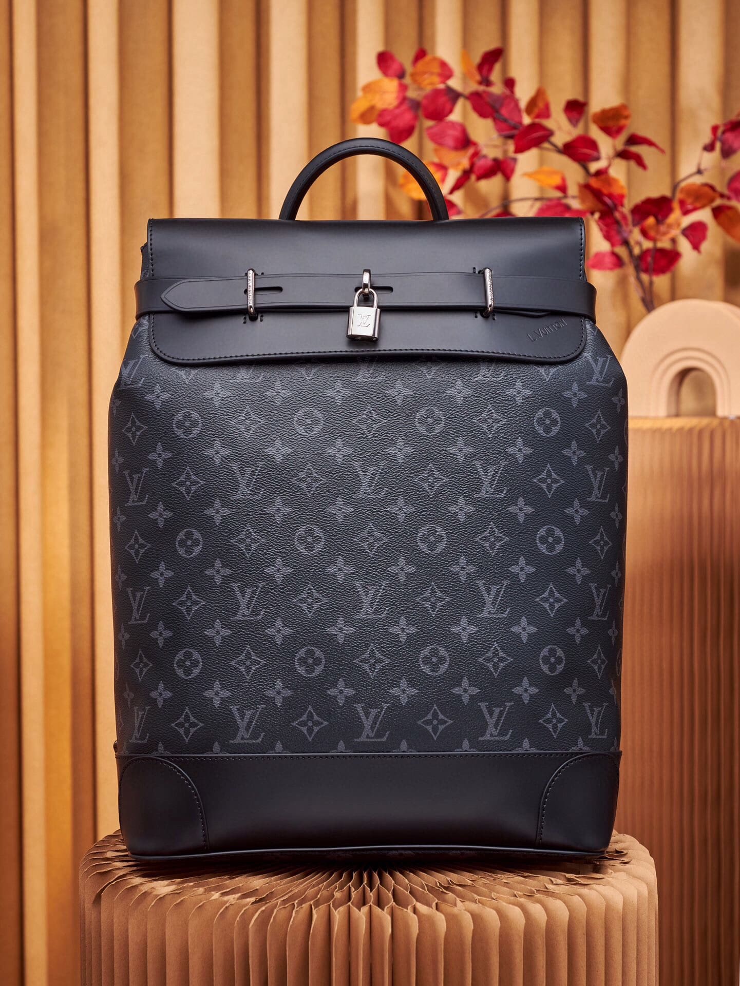 Inspired by the historic Louis Vuitton steamer bag, this Steamer Backpack in Monogram Eclipse canvas with its smart new key shape has a fashion-forward vintage feel. The House craftsmanship is evident in the rounded leather corners and ultra-comfortable leather straps.