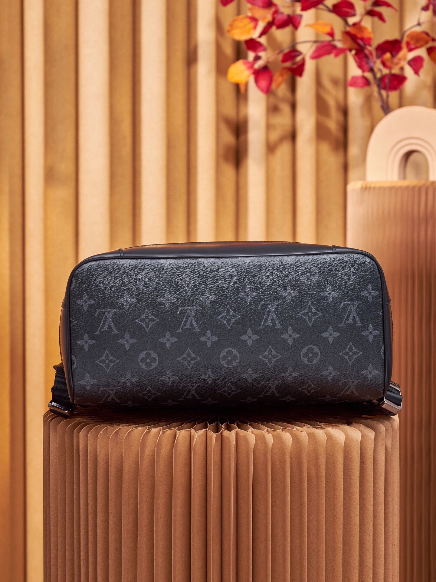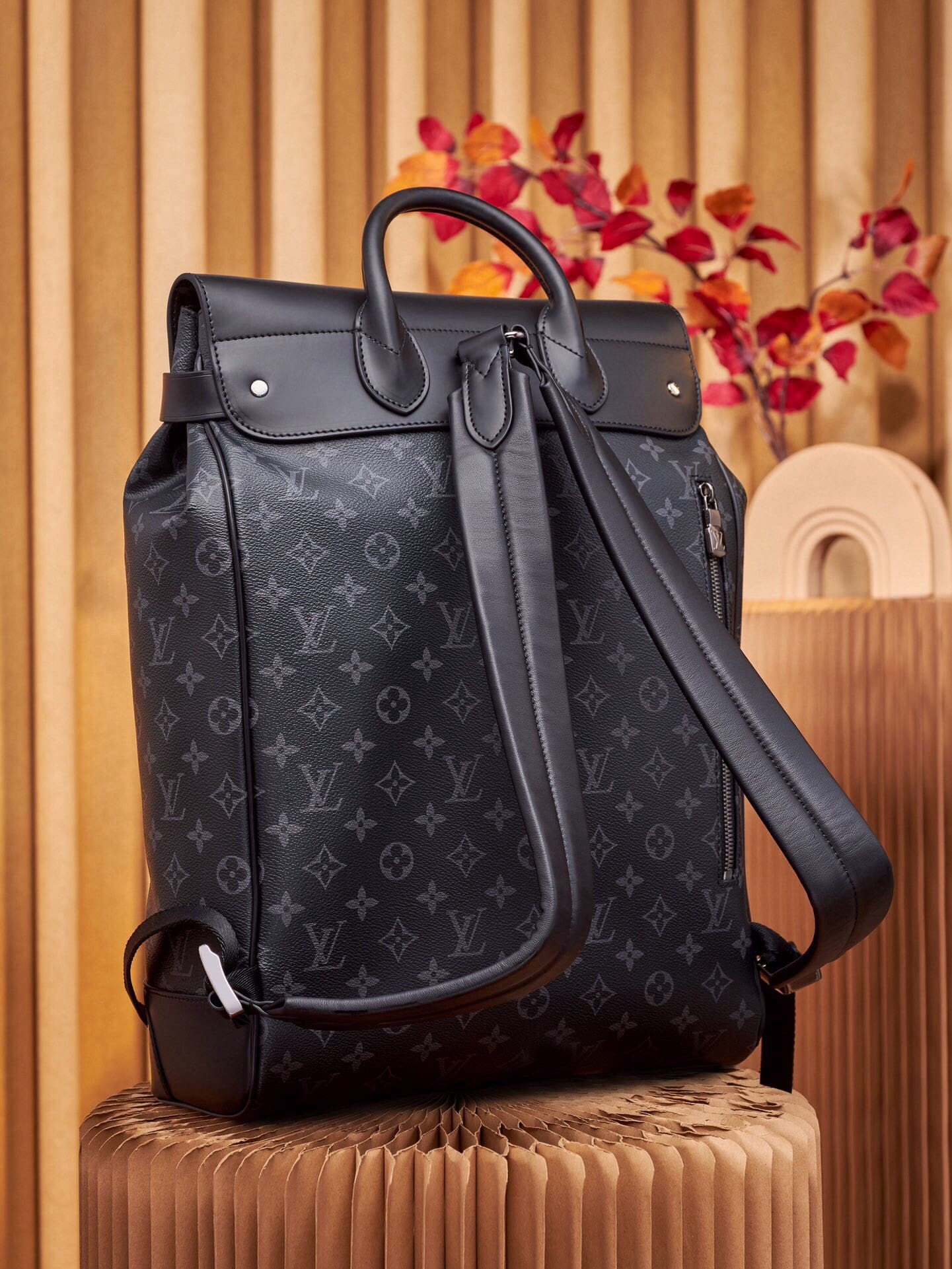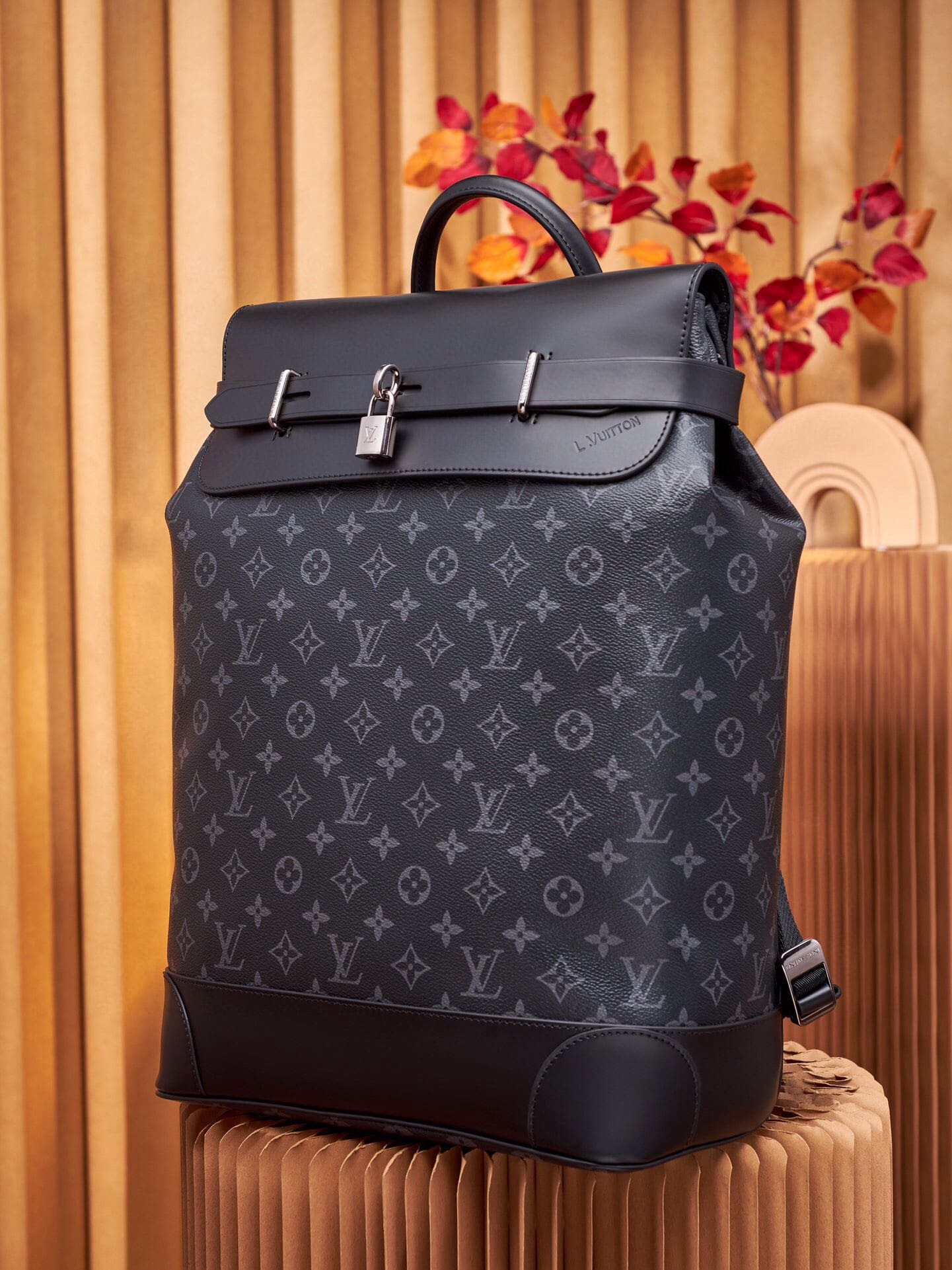 Inspired by the historic Louis Vuitton steamer bag, this Steamer Backpack in Monogram Eclipse canvas with its smart new key shape has a fashion-forward vintage feel. The House craftsmanship is evident in the rounded leather corners and ultra-comfortable leather straps.