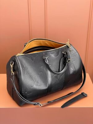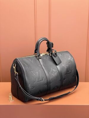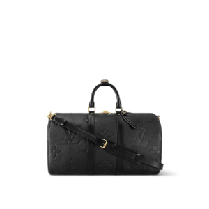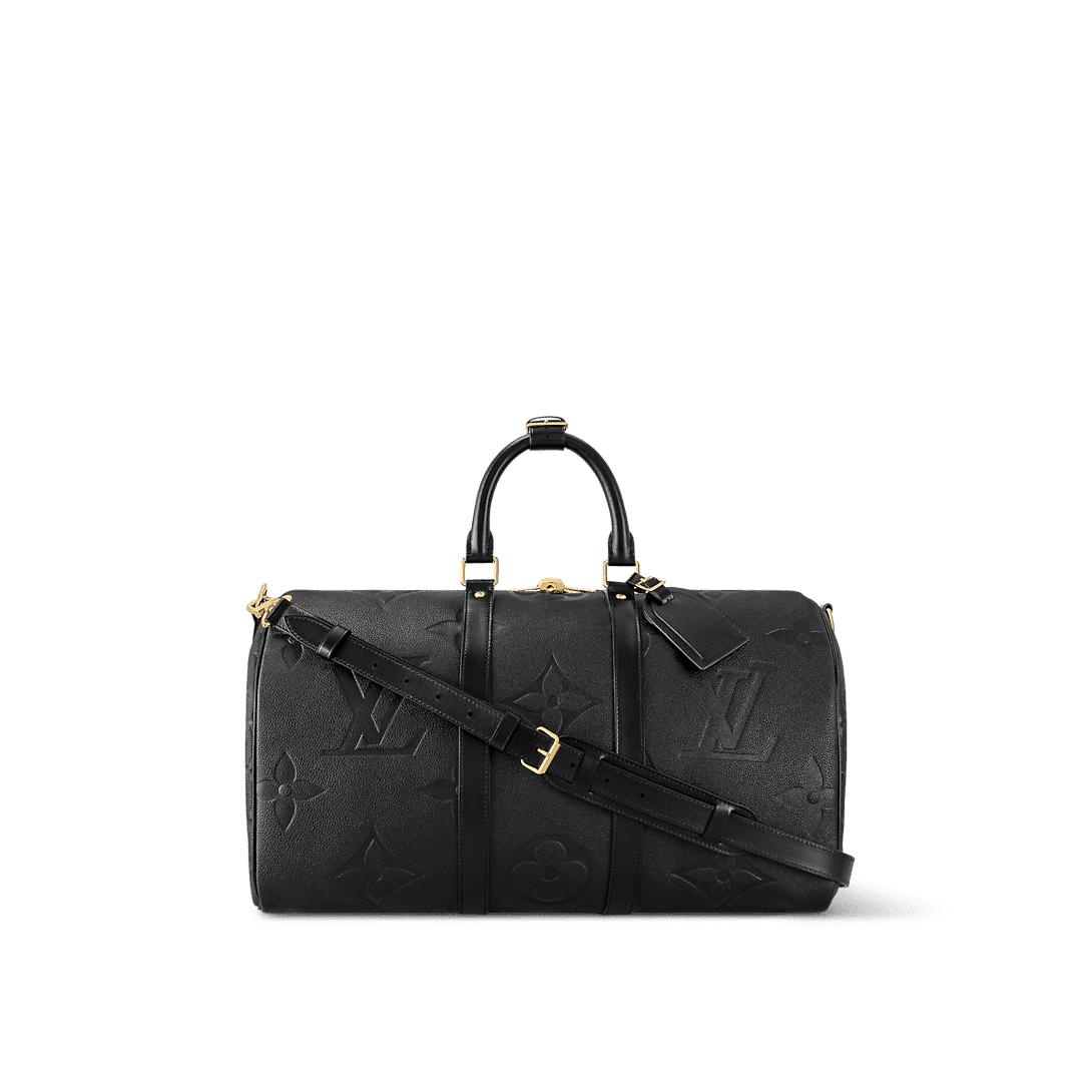 This Keepall Bandoulière 45 is fashioned from Monogram Empreinte Giant leather with gold-color hardware. The supple black cowhide is embossed with an oversized Monogram pattern, giving an understated elegance to this classic soft travel bag. Inside, the colored lining brings a graphic feel whilst the zipped pocket makes it functional.