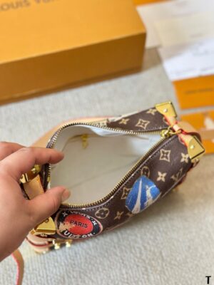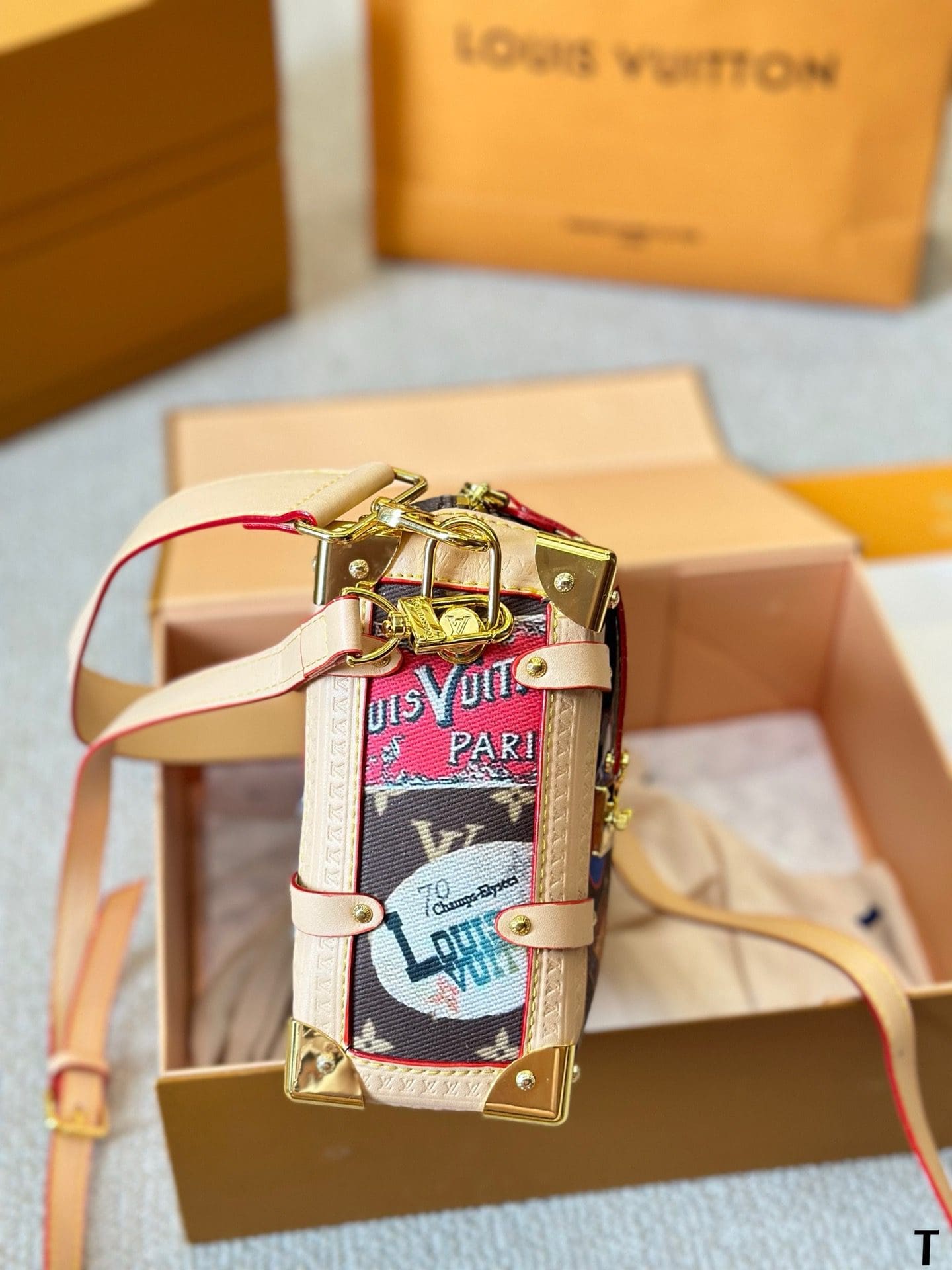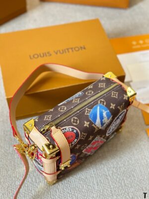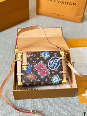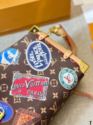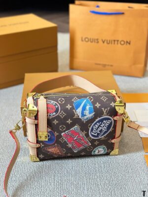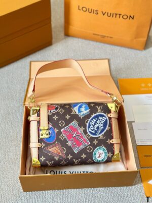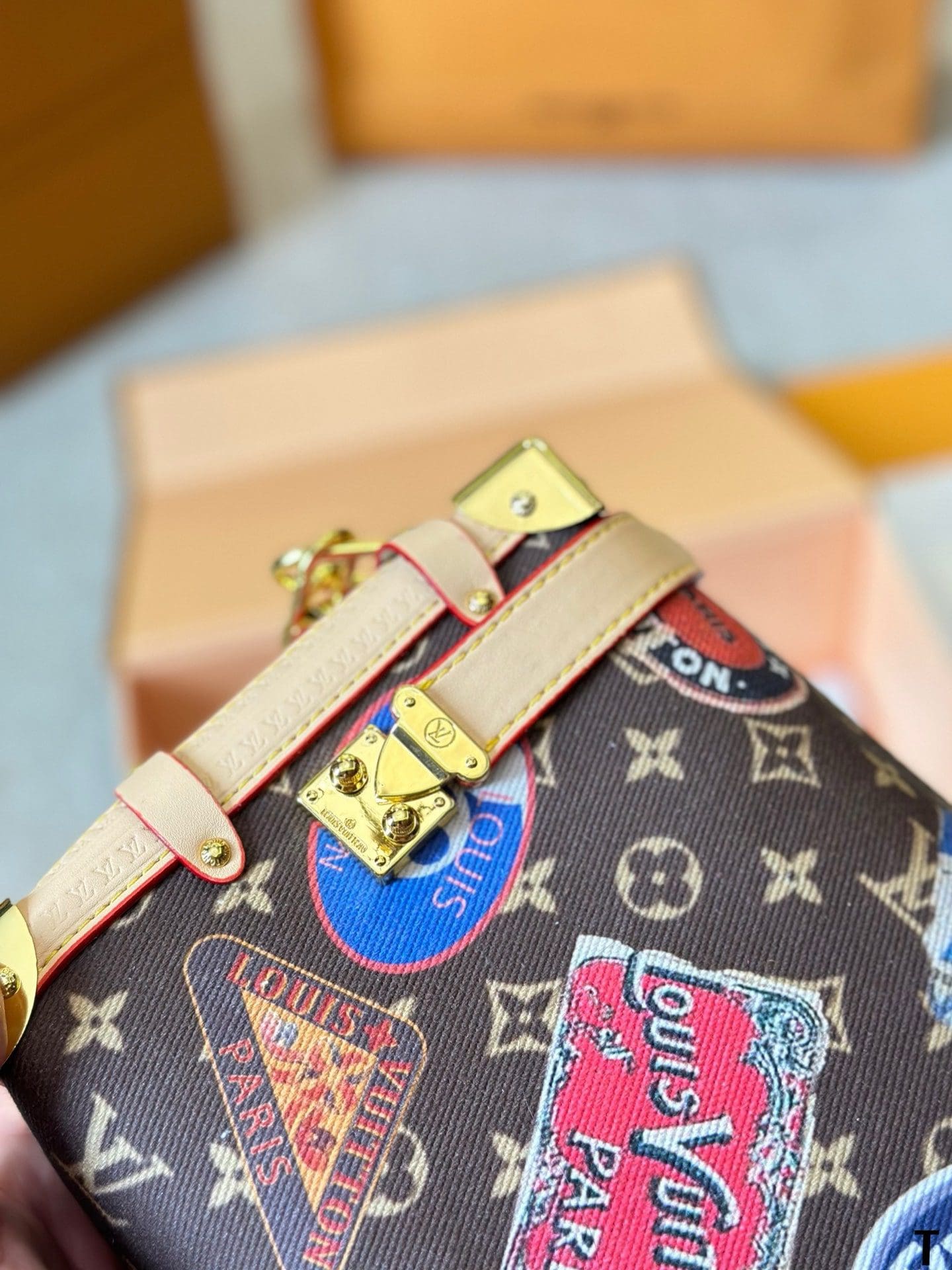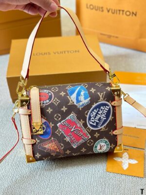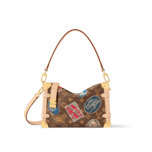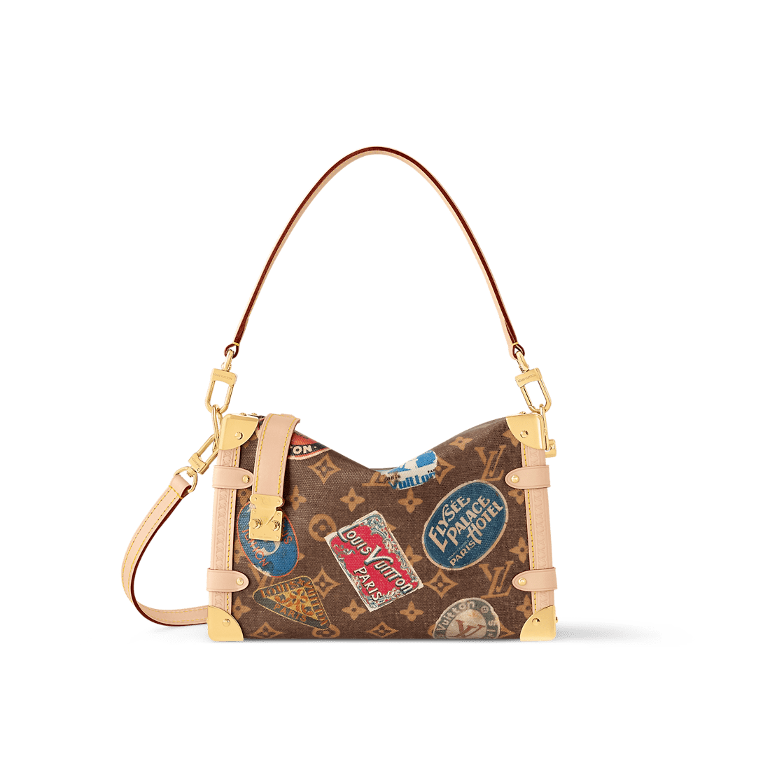 From the Spring-Summer 2024 show comes this Side Trunk MM handbag. It is inspired by the Maison’s archive-trunk Monogram canvas, made of a blend of cotton and linen glazed with resin for a superbly soft hand. Decorated with hotel labels that pay tribute to Gaston-Louis Vuitton’s fabulous collection, the bag is trimmed in heritage natural cowhide-leather. Both handle and strap are removable.