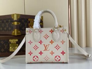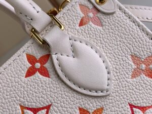 Part of the Sunrise Aquarelle collection, this OnTheGo BB handbag is fashioned from Monogram Empreinte leather in a colorway of orange, pink and fuchsia, inspired by sunrise. The LVs and Monogram Blossoms printed on the leather have a watercolor aspect. A hint of glossiness is screen-printed onto the surface, like glistening drops of morning dew. Two rolled-leather top handles and a removable and adjustable strap enable various carry options.
