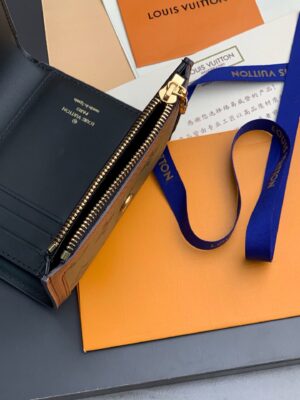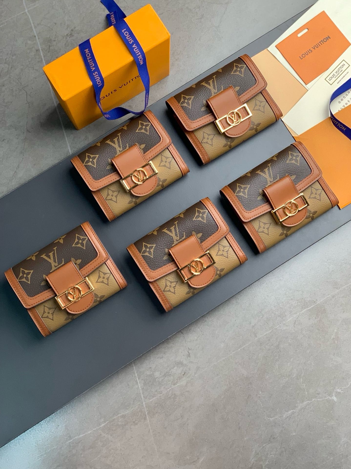 The Dauphine compact wallet takes its style cues from the emblematic Dauphine handbag. Its finely crafted design combines Monogram and Monogram Reverse canvas with calfskin trim, while it is secured by a magnetic Dauphine-signature clasp. This space-efficient wallet features a long pocket for bills and a zipped coin pocket on the side.