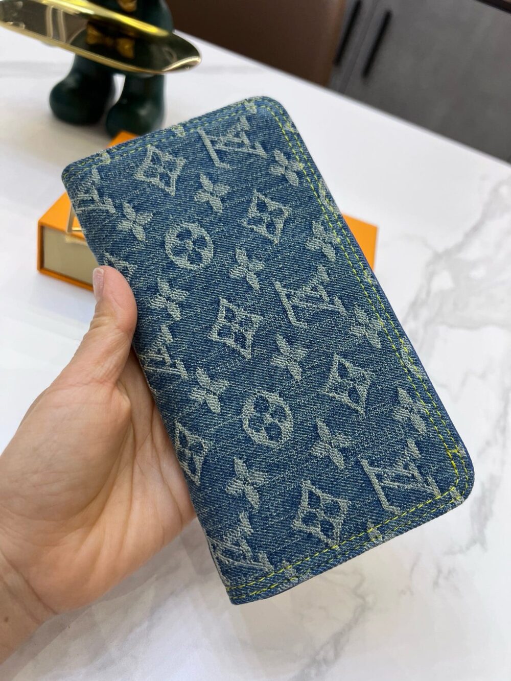 Fashioned from denim with the Monogram pattern woven into the cotton, this Zippy Wallet is stone washed, making each model unique. The House’s classic all-in-one wallet, the Zippy closes with a zipper and has a well-designed interior with three gusseted compartments as well as a zipped coin pocket, two flat pockets, and numerous card slots.