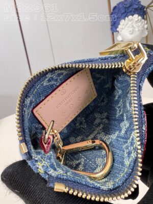 The Key Pouch is made from stone-washed Monogram Denim, with natural cowhide-leather trim and gold-color hardware. In addition to holding keys, it can also be used to securely carry cash and cards thanks to its zip closure. A small hook-and-chain allows it to be attached to a bag or belt.