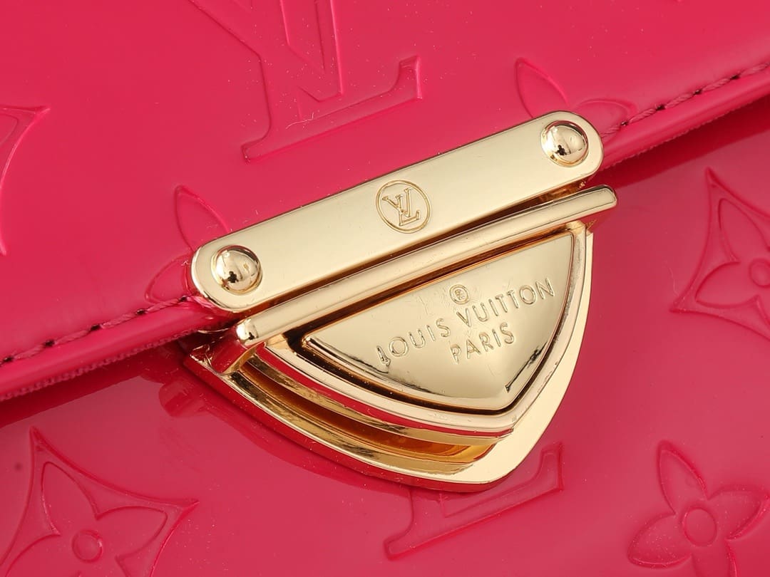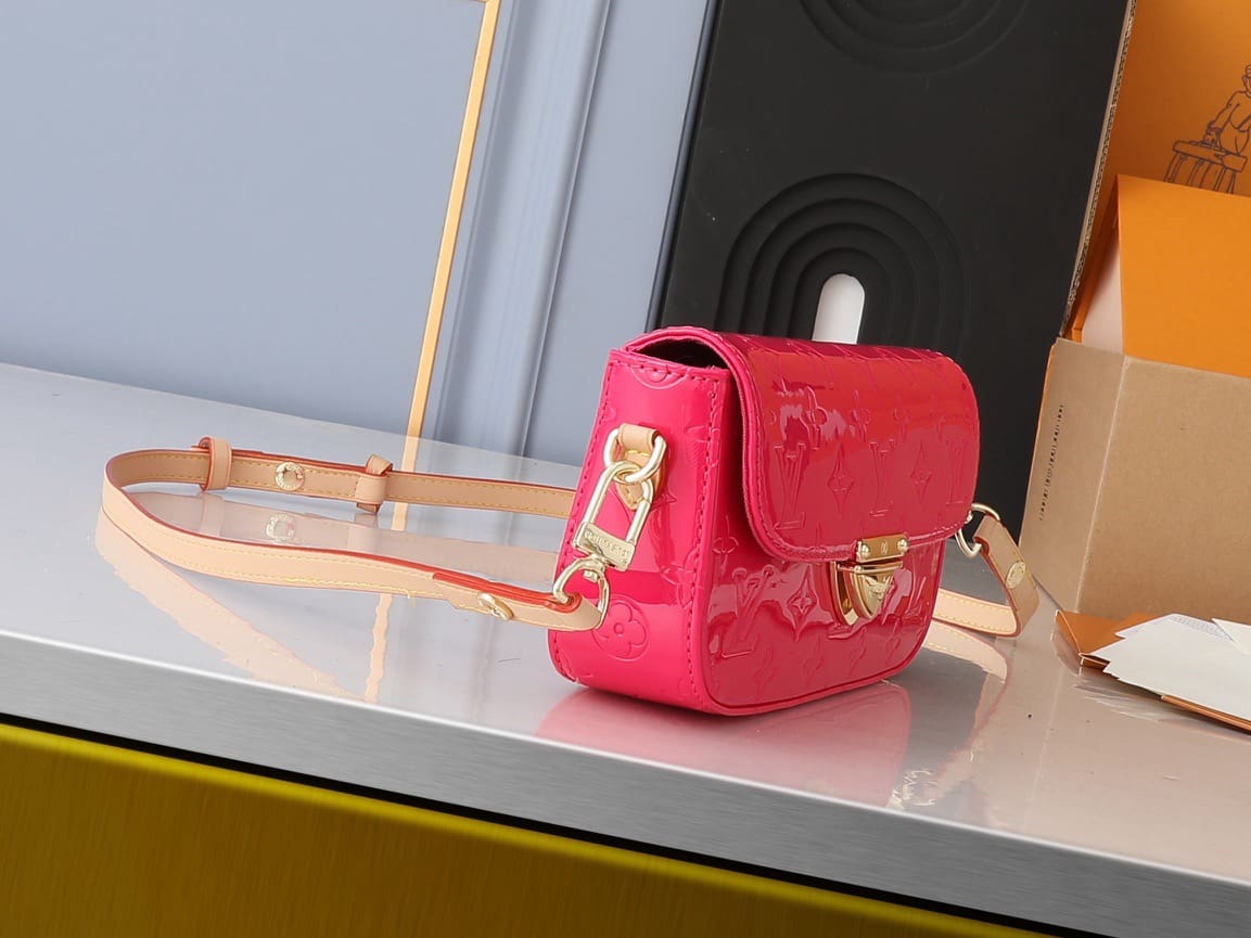 Shiny Monogram Vernis leather and a playful colorway makes this Malibu Pochette bag pop. Finished with gold-color hardware, including the House’s tuck lock on the flap, the Malibu Pochette has a natural cowhide-leather shoulder strap that’s both adjustable and detachable. This stylish little bag fits a smartphone, a small wallet, keys, and earbuds.
