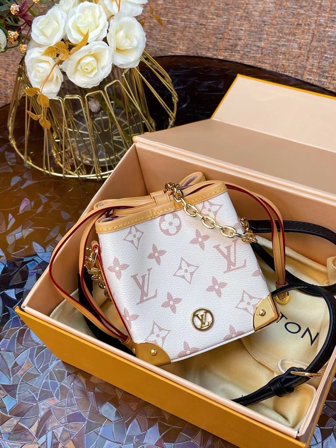 This Noé Purse handbag is made from the Monogram Dune canvas from the 2024 early spring show, creatively interpreting the inspiration of the Noé handbag. LV decoration embellishes the drawstring closure, and the delicate chain and adjustable shoulder strap are detachable, allowing you to switch the carrying method for various styles.