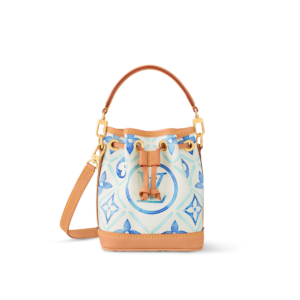 The Nano Noé bag is revisited with a Mediterranean-style Monogram Tiles print on coated canvas as part of the LV By the Pool collection, which evokes travel to sunny destinations. Leather trim complements this design, notably on the removable top handle and removable, adjustable shoulder strap, which offer different carry options.