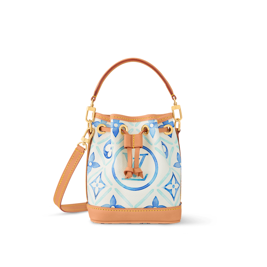 The Nano Noé bag is revisited with a Mediterranean-style Monogram Tiles print on coated canvas as part of the LV By the Pool collection, which evokes travel to sunny destinations. Leather trim complements this design, notably on the removable top handle and removable, adjustable shoulder strap, which offer different carry options.
