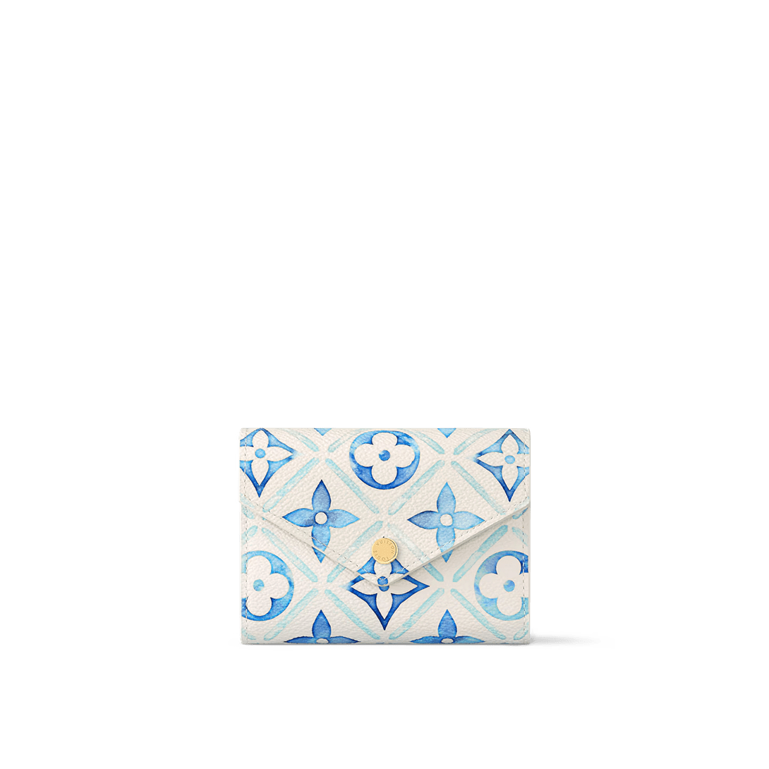For the LV By the Pool summer collection, the Victorine wallet is reinterpreted in coated canvas with a vibrant Monogram Tiles print, inspired by the Mediterranean. Notable for its square format, this tiny, envelope-style wallet is surprisingly spacious, offering pockets for coins and bills, as well as six card slots.