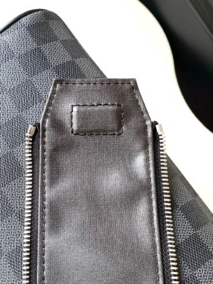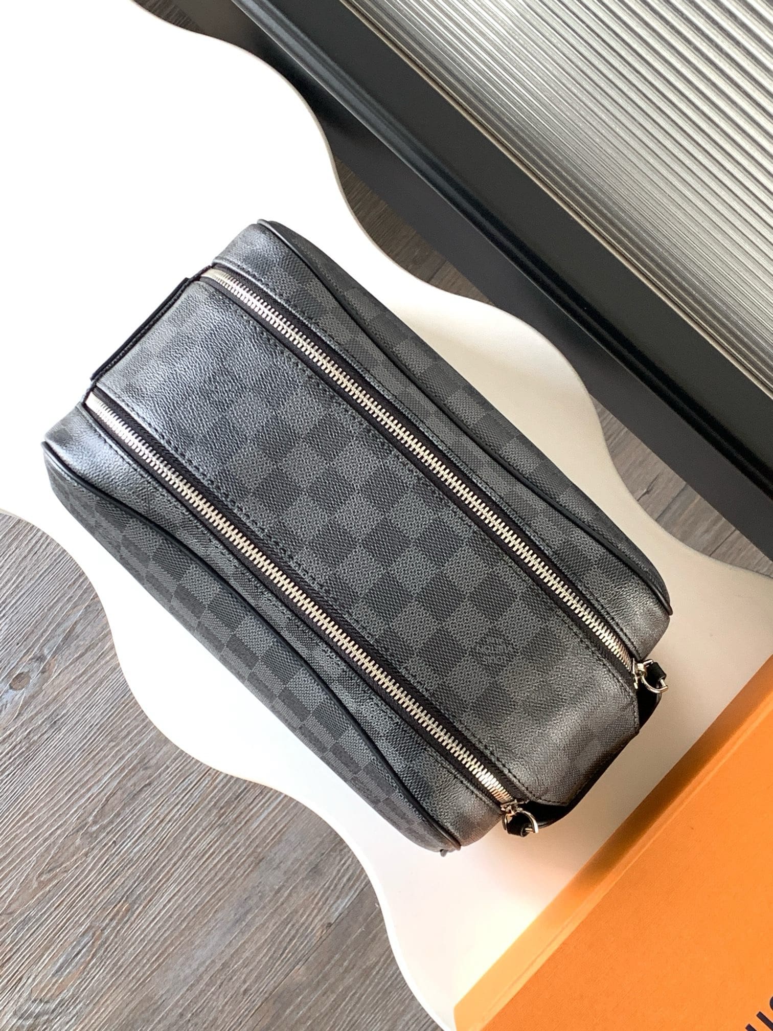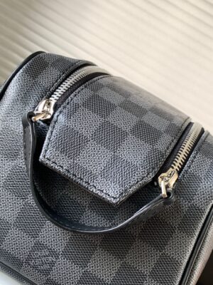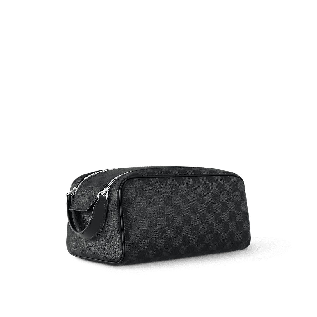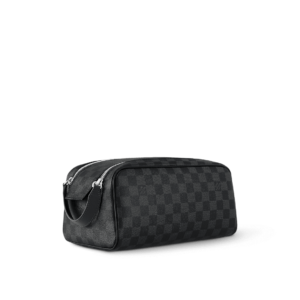 The Dopp toiletry bag is made of classic Damier Graphite canvas and cowhide leather trim to create a tough design. The double zipper hides ample internal space for easy access to toiletries and grooming utensils. The wide handle allows for comfortable hand carrying or hanging on a bathroom hook.