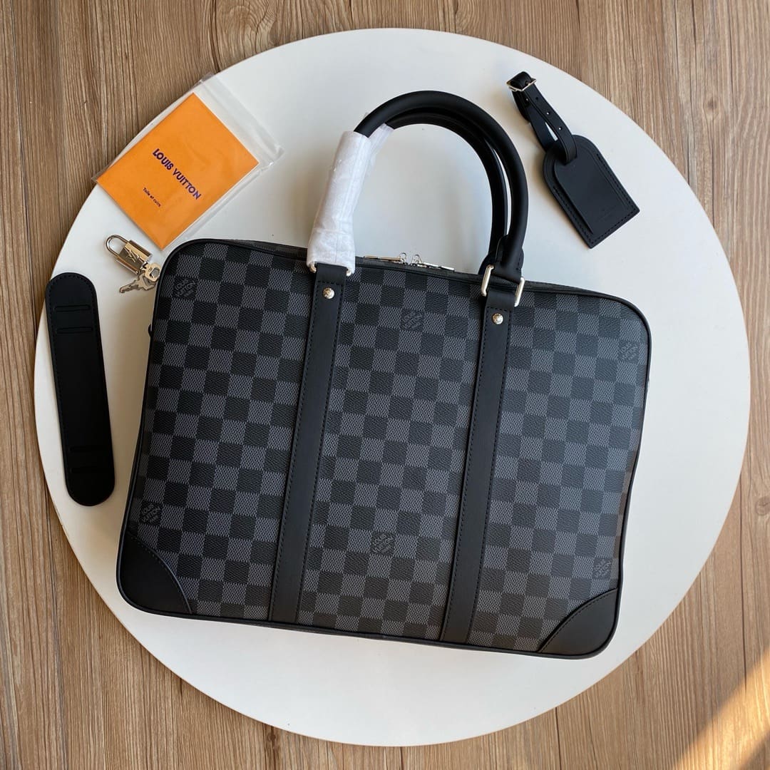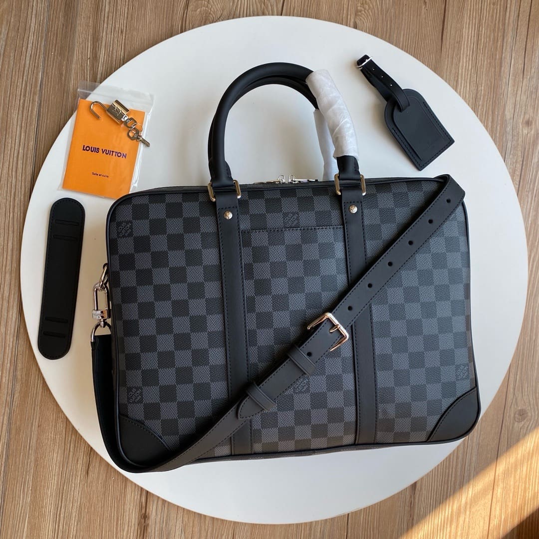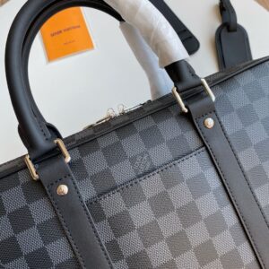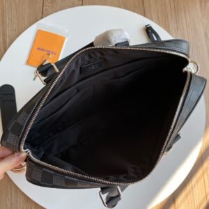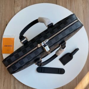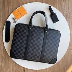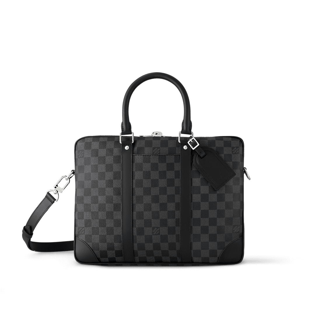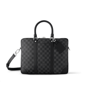 The Porte-Documents Voyage PM briefcase is made from Damier Graphite coated canvas with black-leather side bands, reinforced corners, top handles, and name tag. There’s an outside pocket for a smart phone and a padded interior compartment large enough for a 13-inch laptop. The removable and adjustable strap enables shoulder carry.