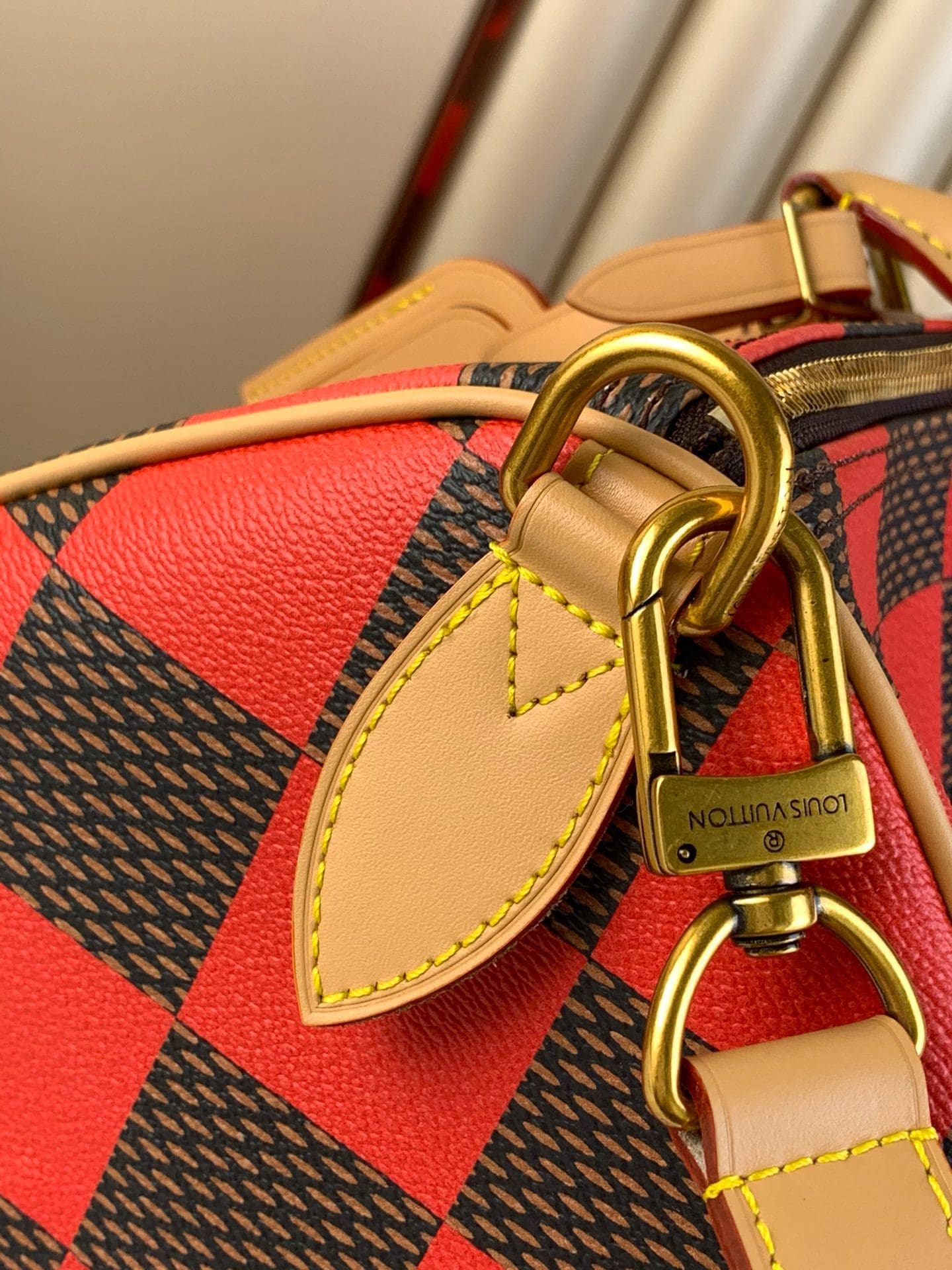 This Speedy 40 Bandoulière Damier Pop is made from Damier Pop canvas, Creative Director Pharrell Williams’ new version of House’s Damier checkerboard. The colorful pattern is combined with natural cowhide leather on the top handles and shoulder strap and polished gold-color hardware, including a padlock. This slightly smaller version of the Speedy is ideal for weekend getaways.