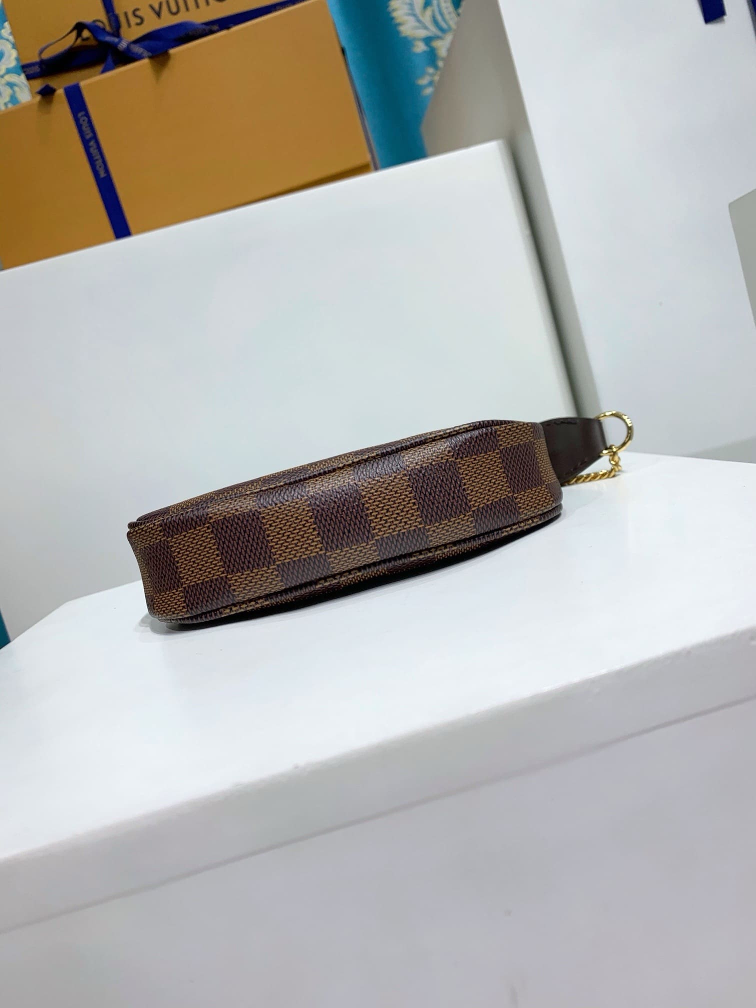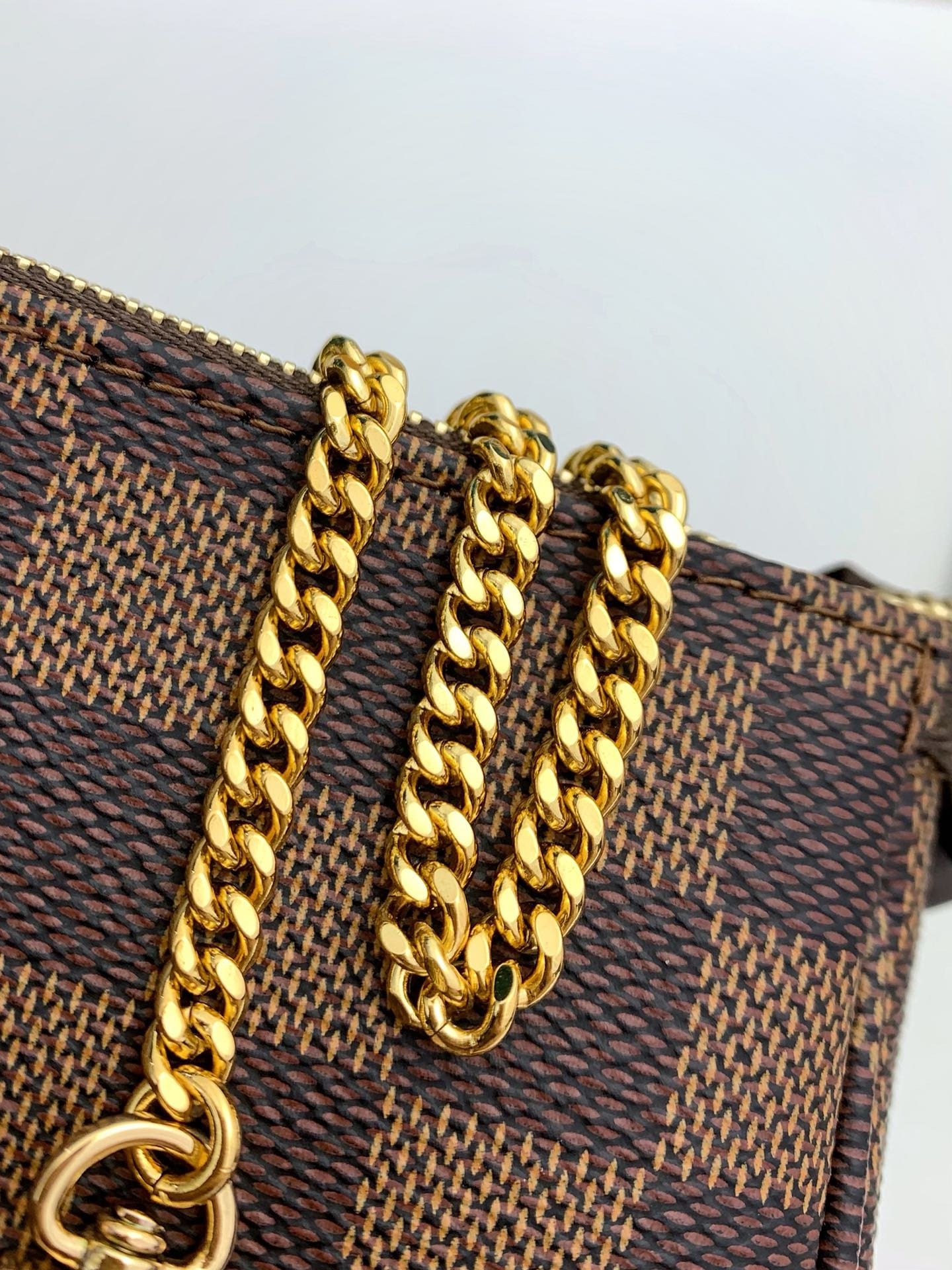 The Mini Pochette Accessoires in Damier Ebene canvas is the perfect way to carry essentials. Its supple, rounded shape gives this pouch a particularly pleasant feel, while its zipped compartment offers a surprising amount of space. It can be hand-carried or attached to a larger bag thanks to the gold-tone chain and hook.