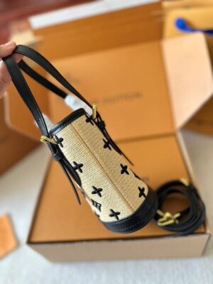 This elegant iteration of the Nano Bucket is crafted from natural cotton with black leather trim and a black Monogram pattern. This miniature bucket bag has two adjustable leather handles and an adjustable, removable shoulder strap, offering different carry options. Its inside compartment contains a leather key holder.