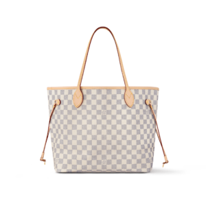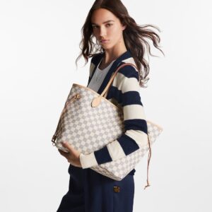 The Neverfull MM tote unites timeless design with heritage details. Made from fresh Damier Azur canvas with natural cowhide trim, it is roomy yet not bulky, with side laces that cinch for a sleek allure or loosen for a casual look. The slim leather handles slip easily over the shoulder or arm. Lined in colorful textile, it features a removable pouch which can be used as a clutch or an extra pocket.