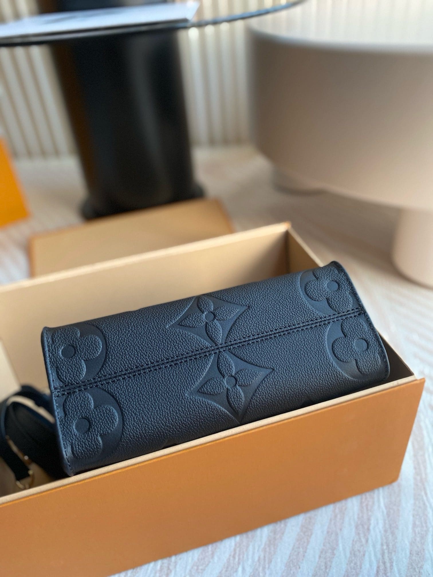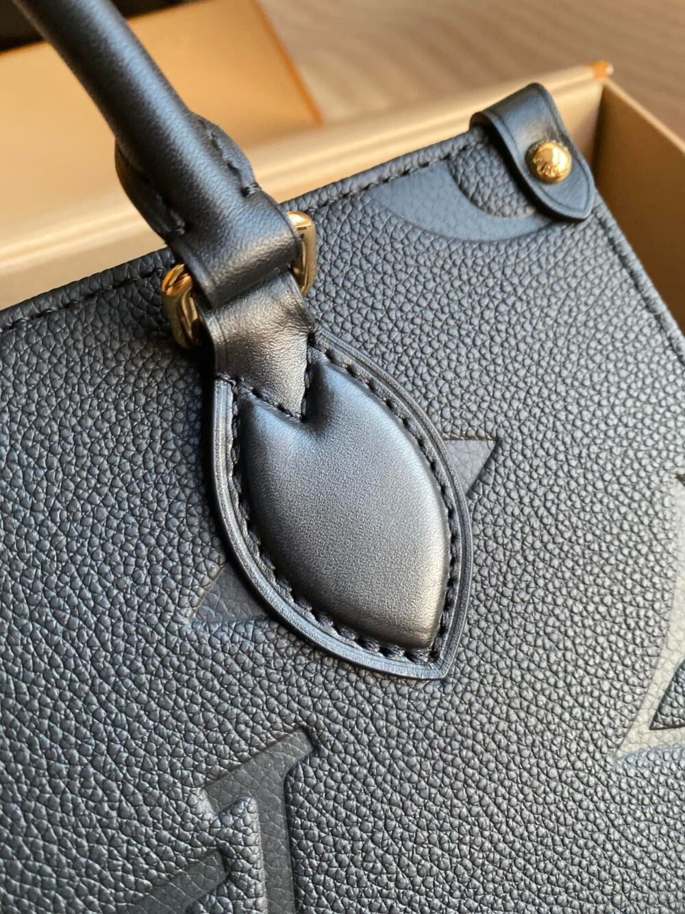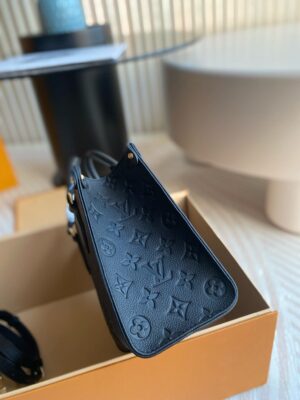 Inspired by Louis Vuitton’s famous Sac Plat from 1968, the Onthego PM tote is fashioned in Monogram Empreinte leather, embossed with a subtle embossed Giant Monogram pattern. This smaller version of the original Onthego fits essentials such as an iPad Mini. Articulated top handles and an adjustable removable strap offer a variety of carry options.