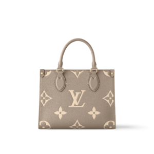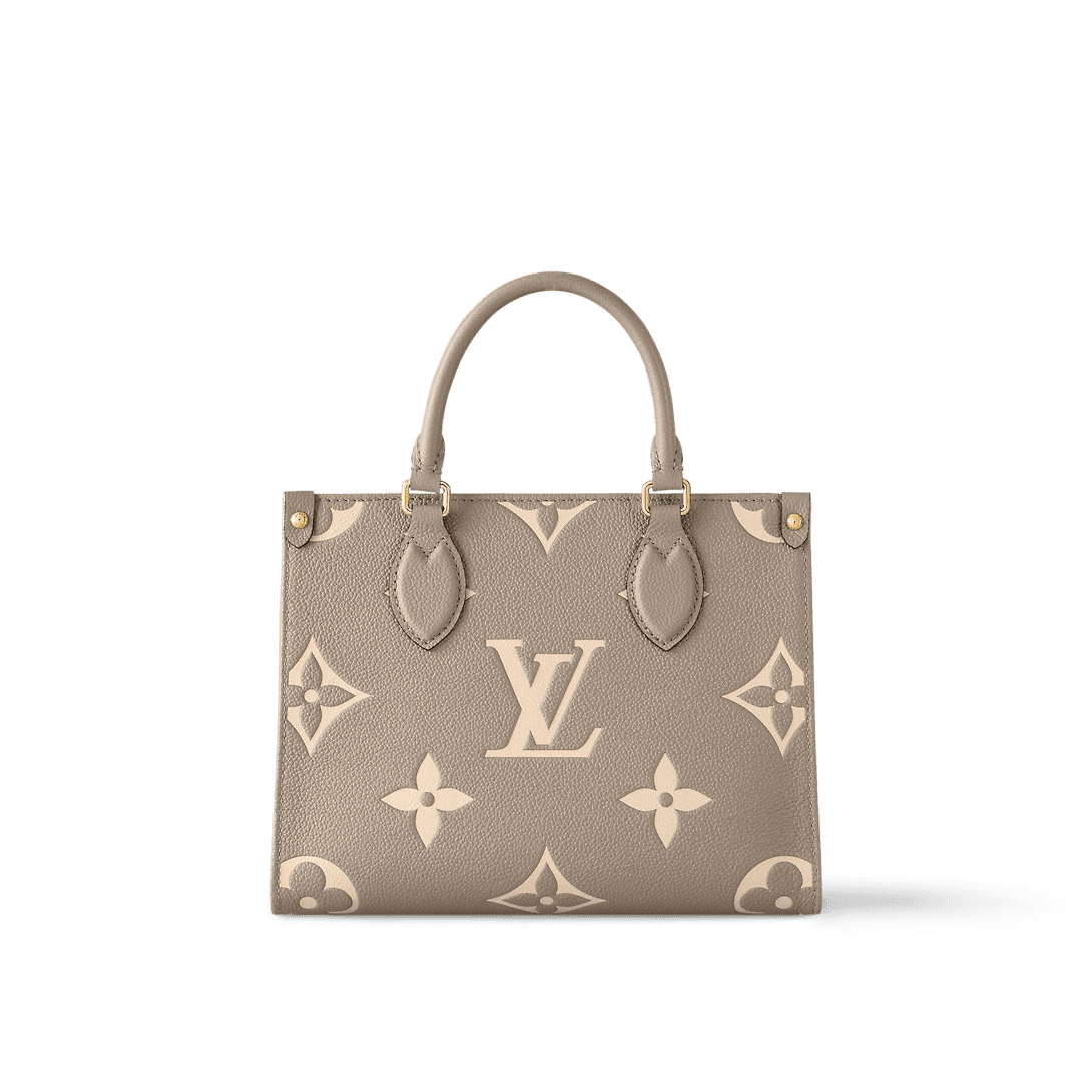 Inspired by Louis Vuitton’s famous Sac Plat from 1968, the Onthego PM tote is fashioned in Monogram Empreinte leather, embossed with a Giant Bicolor Monogram pattern. This smaller version of the original Onthego fits essentials such as an iPad Mini. Articulated top handles and an adjustable removable strap offer a variety of carry options.