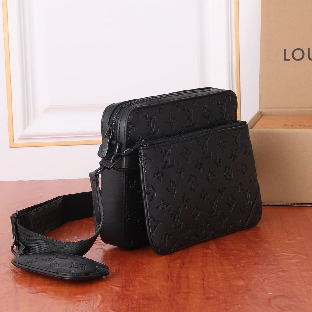 • The Trio Messenger in Monogram-embossed calf skin is a fashionably hybrid bag. It combines a main compartment and a removable front zipped pocket, with a detachable small coin purse on strap. An adjustable and removable “Louis Vuitton”-signed jacquard textile strap enables comfortable shoulder and cross-body carry.