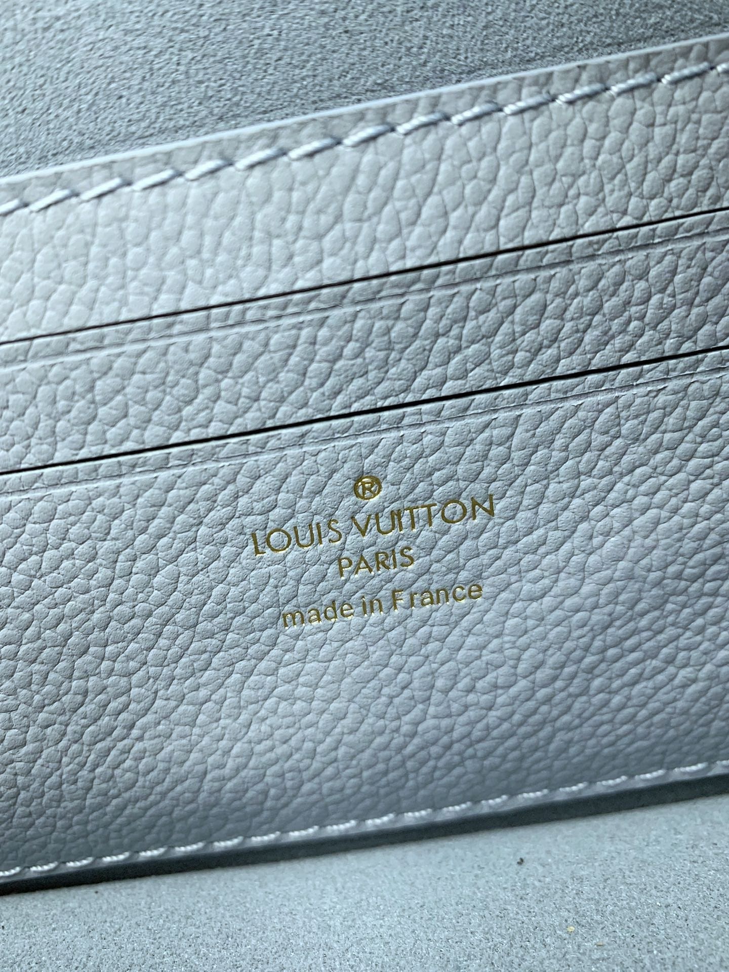The Lily wallet on chain is crafted from supple, grained Monogram Empreinte leather. This tiny flap bag, which will hold essentials for day or evening, combines a sleek rectangular shape with a subtle retro look. It is complemented by gold-tone hardware, notably a Louis Vuitton-engraved plate and a removable, adjustable chain with an LV Circle charm.