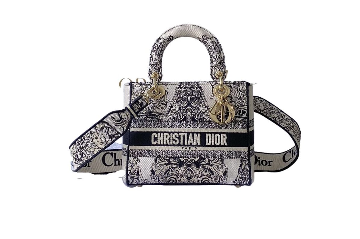 The Lady D-Lite bag combines classic elegance with House modernity. The style is fully embroidered with the season’s signature black and white Plan de Paris motif, inspired by House archives and centered around Dior’s historic address on Avenue Montaigne. The front features a Christian Dior Paris signature while the D.I.O.R. charms in pale gold-finish metal embellish and illuminate the silhouette. Equipped with a wide, reversible and removable embroidered shoulder strap, the medium Lady D-Lite bag can be carried by hand or worn crossbody.
