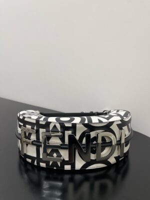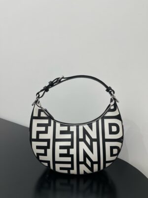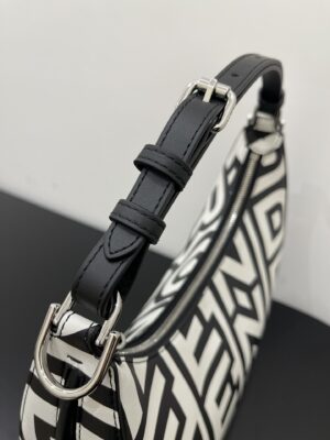 Medium Nano Fendigraphy Hobo Bag with zip closure, embellished with coloured metal FENDI lettering. The adjustable strap with a clip allows it to be attached to larger bags or worn on the wrist. Comes with hooks for the shoulder strap. Made of printed with the Fendi Roma logo in white and black, reinterpreted by Marc Jacobs in an all-over, oversize style. finish metalware. Embellished with the exclusive Fendi Roma Marc Jacobs New York City label.