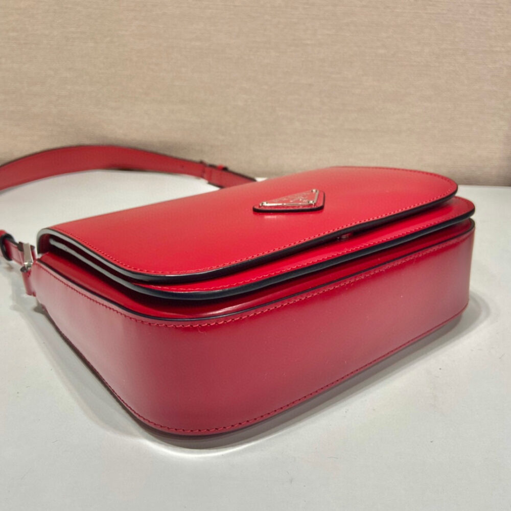 Elegance and practicality meet in this bag with a hybrid character that combines sleek and modern lines, functionality, and fine materials. Made of Prada’s iconic brushed, a material that is as chameleonic as it is luxurious, this rigid, curvy bag is characterized by its flap closure and shoulder strap that is adjustable for wear as a crossbody or shoulder bag. Decorating the flap is the emblematic metal triangle logo created by founder Mario Prada and reinvented on contemporary designs.