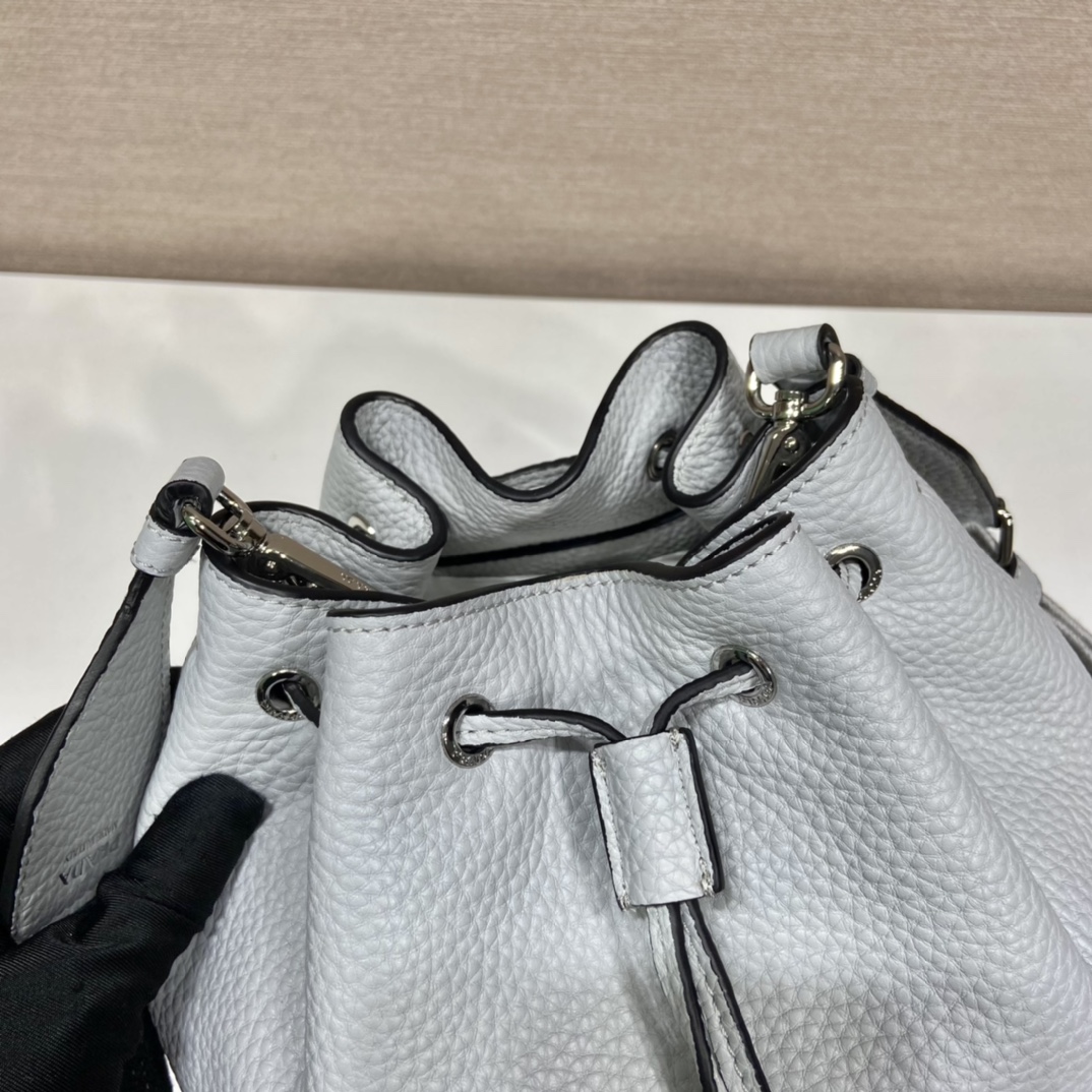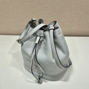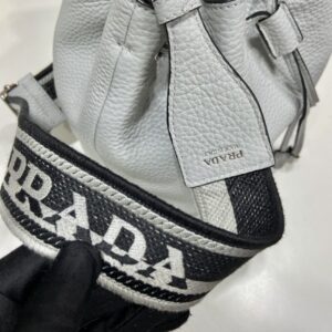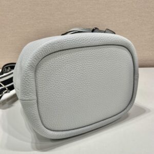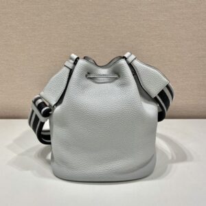 A soft silhouette with modern, feminine allure defines this bucket bag. The accessory decorated with the triangle logo is completed by the detachable woven tape shoulder strap embroidered with the logo in a contrasting color, that makes it wearable as a crossbody or shoulder bag.