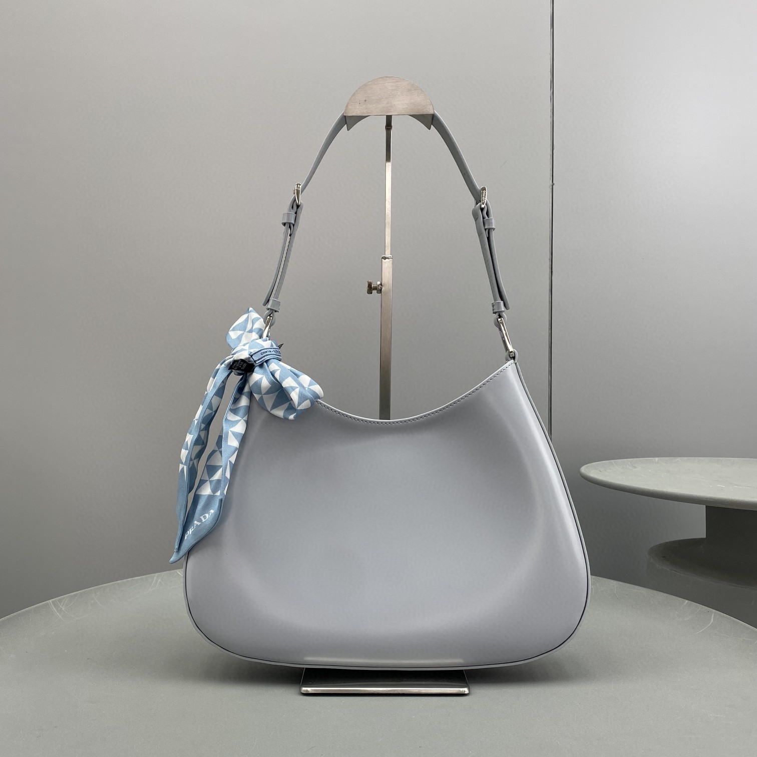 The Prada Cleo bag with sophisticated allure reinterprets an iconic design of the brand from the nineties. The sleek, curved lines emphasized by the particular sloped construction of the bottom and sides give this hobo bag a soft, light look. Brushed a distinctive element of Prada collections, is a modern and versatile material that lends itself to always new combinations and contrasts. The enamel triangle logo decorates the silhouette.