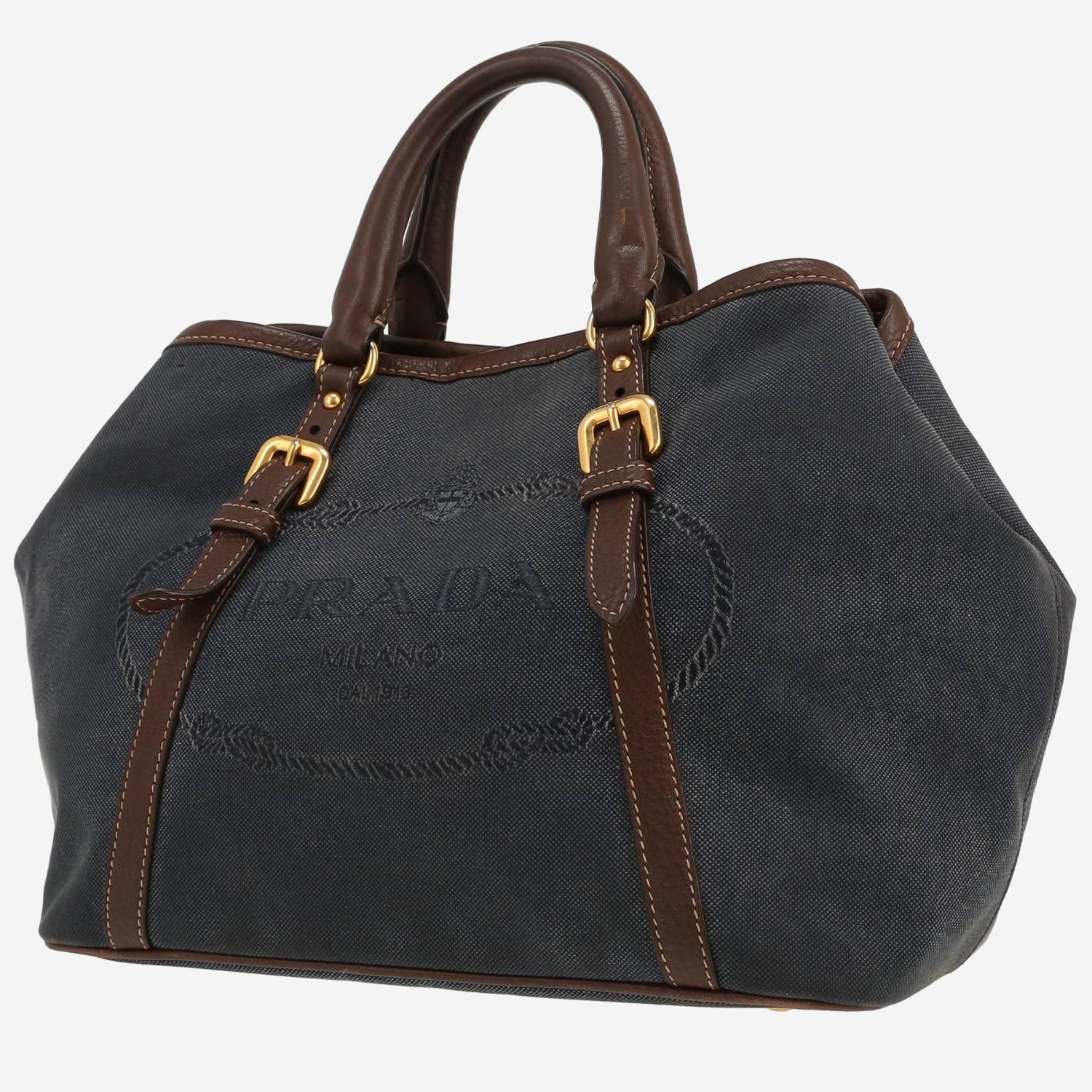 Prada handbag in navy blue canvas and brown leather