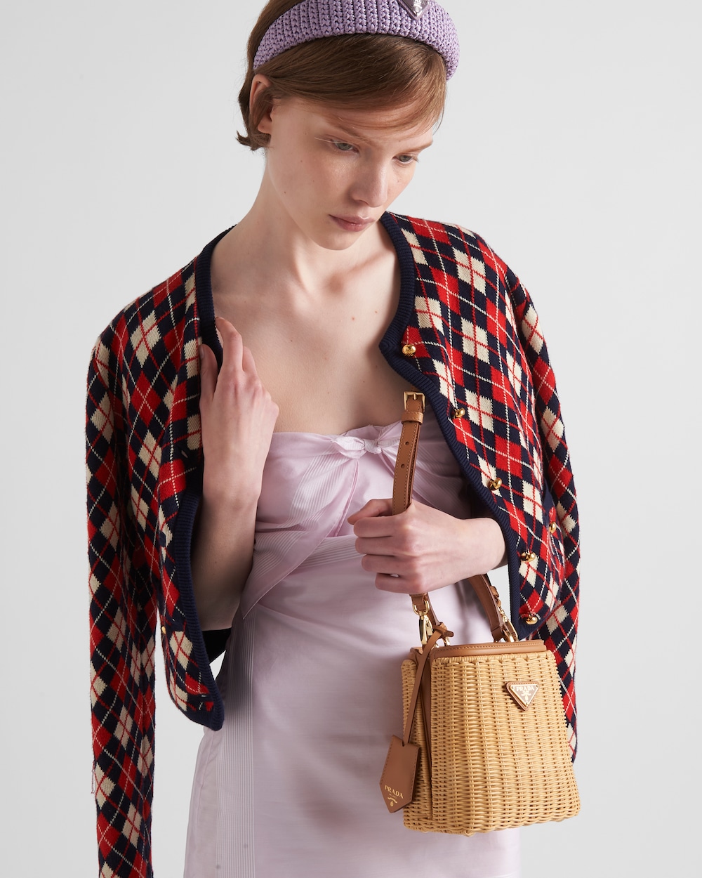• The Prada Panier bag combines retro charm and contemporary details in a rigid silhouette made of wicker . Reinterpreted in a mini version, the style has a detachable and adjustable shoulder strap for wearing different ways. Illuminated by gold-tone metal hardware, the accessory is enriched by the enameled metal triangle logo