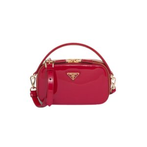 Sleek, elegant lines create this patent-leather mini-bag with a sophisticated character. The versatile, structured design, carried by hand or worn over the shoulder with the removable strap, is completed with a two-way zipper closure and embellished with the enameled metal triangle logo.