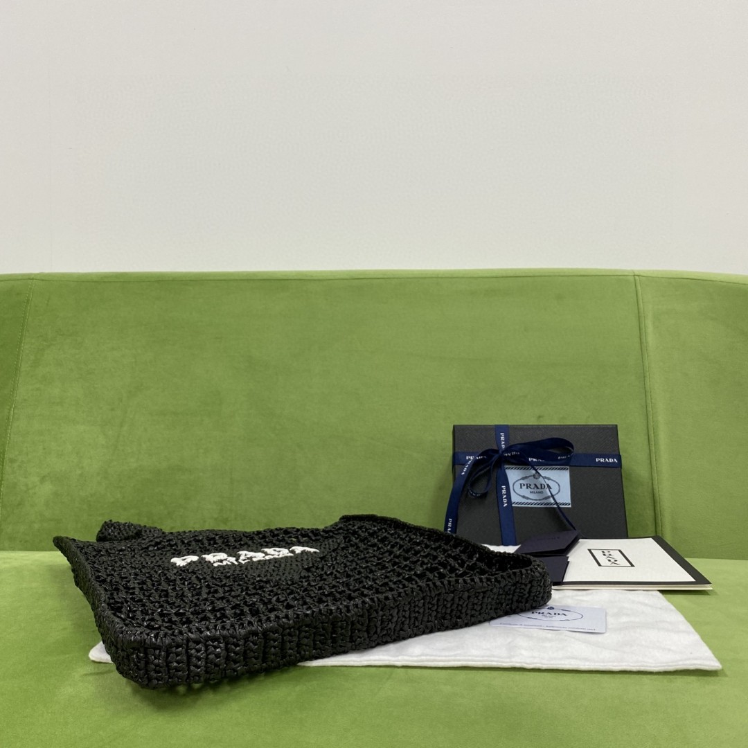 This tote bag with a soft, deconstructed design is made of raffia, a material of natural origin imbued with a summery mood. A new interpretation of the emblematic Prada triangle decorates the front and is embellished with the embroidered lettering logo at the center.