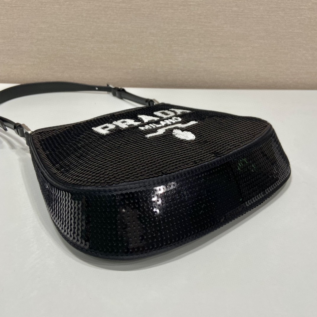 A new interpretation of an iconic Prada style, the Re-Edition 2000 mini-bag is covered with all-over sequins that create a play of light and iridescent glimmers on the surface. The design is made of innovative Re-Nylon, produced from recycled, purified plastic materials collected in the ocean, fishing nets, and textile fibers. The accessory with zipper closure and woven tape handle is enhanced with the distinctive enameled metal triangle logo.