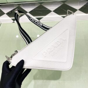 This triangular bag in Prada’s emblematic geometric shape is made of Saffiano , an iconic material of the brand defined by its crosshatch texture and waxed finish. The triangle logo is also found in the embossed macro detail decorating the front. The Re-Nylon lining, an innovative fabric made of regenerated nylon yarn, completes the design.