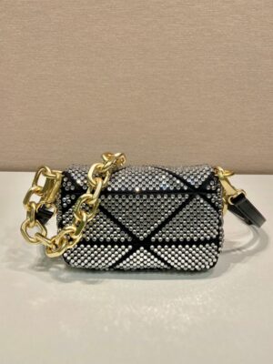 Satin Mini-Bag With Crystals precious stitching, an expression of the brand’s know-how, forms a triangle motif on this mini-bag with chain handle that recalls the jewelry world. Plays of light and iridescent reflections characterize the accessory decorated with the metal triangle logo on the front.
