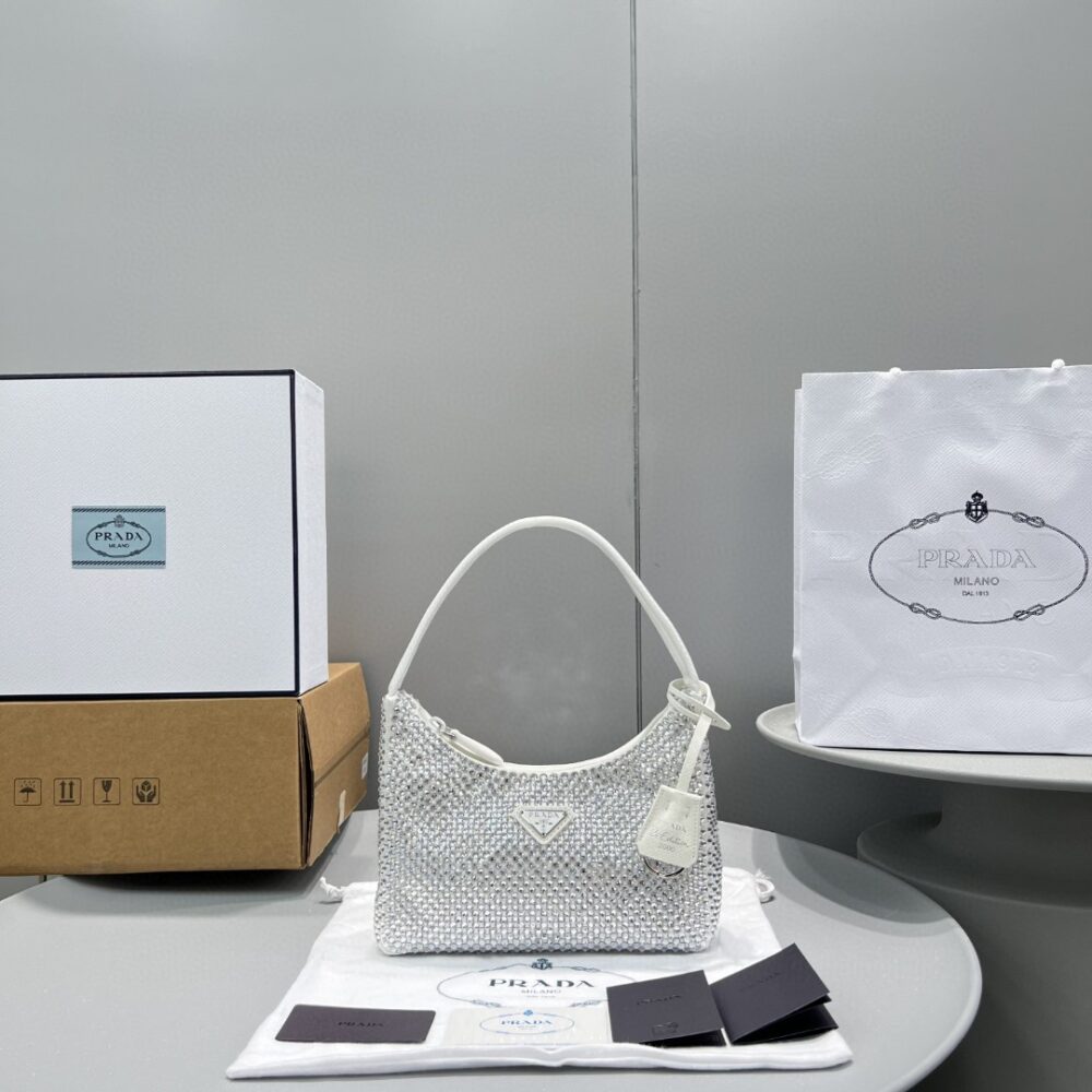 This mini hobo bag, an iconic Prada style, comes in a luxurious satin version studded with crystals and decorated with the emblematic enamel triangle logo.