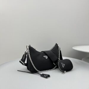 An exquisite patchwork technique, an expression of brand know-how, forms a triangle motif on this Prada System shoulder bag with chain handle. The detachable woven shoulder strap, which allows the accessory to be worn in different ways, has a detachable pouch, a recurring detail of Prada collections.